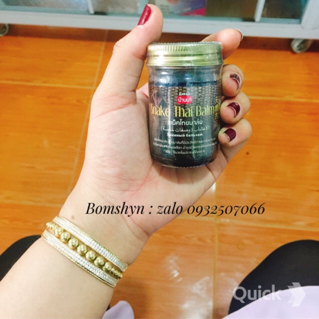 ️Dầu cù là rắn Thái Giảm nhanh các triệu chứng nhức đầu, chóng mặt, đau lưng, thấp khớp, bong trật gân. Công Dụng: – Dầu cù là rắn chuyên trị nhức mỏi, đau lưng, đau khớp do tập thể thao hoặc vận động quá sức. – Giảm nhanh các triệu chứng nhức đầu, chóng mặt, đau lưng, thấp khớp, bong trật gân. – Giữ ấm thân thể khi bị nhiễm cảm lạnh. – Với hương thơm nhẹ nhàng, dễ chịu, giúp tinh thần sảng khoái, chấm dứt ngay những mệt mỏi hàng ngày. – Giảm sưng tấy, ngứa rát tức thời tại các vết côn trùng cắn. – Sản phẩm có thể dùng cho cả người lớn lẫn trẻ em. Hướng Dẫn Sử Dụng : – Chỉ dùng ngoài da. Không được uống. – Bôi vào chỗ đau nhức xương khớp. Bôi, ngửi khi bị cảm lạnh, hoa mắt chóng mặt, nhức đầu ngày 3-4 lần. – Xoa bóp vào nơi bị bầm tím, bôi vào nơi bị côn trùng đốt (cắn) ngày 3-4 lần. #cula #thailand #rắn #xoabop Xuất xứ : Thái Lan Trọng lượng : 50 gram