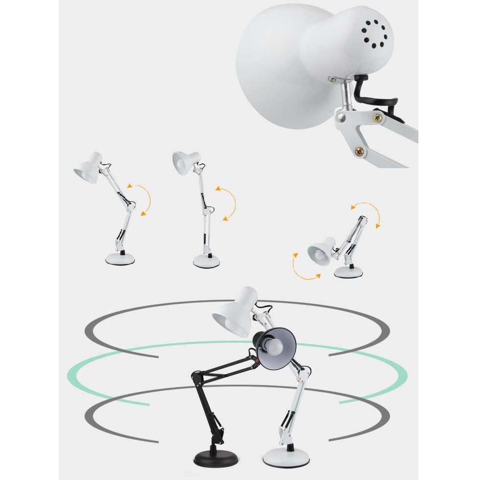 ️- Thân đèn kẹp bàn pixar là thép ống cứng được sơn tĩnh điện cứng cáp & chắc chắn chia làm 2 khúc với 3 khớp xoay được phụ giúp bởi 4 lò xo khiến các thao tác kéo - gập - vặn rất nhẹ nhàng và đơn giản. - Chụp đèn kẹp bàn pixar tráng men trắng bên trong cho khả năng phản chiếu ánh sáng cực tốt -Có thể điều chỉnh độ cao, thấp, thay đổi hướng ánh sáng một cách linh hoạt mà không cần phải di chuyển chân đế hay vị trí lắp đèn. - Đèn kẹp bàn pixar luxo giúp không gian học tập và làm việc của bạn trở nên hiện đại, tiện nghi hơn. Kích thước: tối đa cao 60cm. Công suất : 200W - nên dùng loại bóng từ 20 - 30w để dùng đèn học. Còn vẫn có thể dùng 150 - 200w làm bóng sưởi. Đui đèn E27 Lưu ý: Sản phẩm không kèm bóng đèn ....