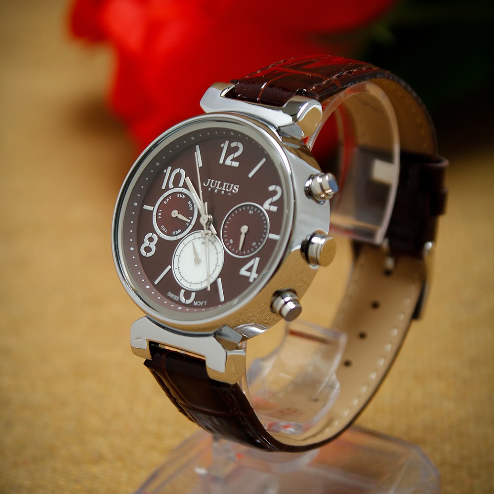 ️THÔNG SỐ SẢN PHẨM Thương hiệu: JULIUS Mã sản phẩm: JA-850C JU1076 (Nâu) Dành cho: Nữ, sinh viên, nhân viên văn phòng, doanh nhân… Chất liệu dây: Dây da Genuine Leather bền bỉ Chất liệu mặt kính: Mặt kính khoáng cao cấp trong suốt rõ nét, độ cứng cao (chống va đập tốt ở mức sinh hoạt hàng ngày) Kích thước bề mặt: 4cm (Mặt tròn) Tổng độ dài dây: 18cm Kiểu khóa: Khóa gài Chất liệu vỏ máy: Hợp kim mạ màu bạc, sử dụng công nghệ mạ IP chân không tiên tiến giúp đem lại độ sáng bóng và bền màu Máy: Quartz Thụy Sĩ Swiss ISA 9238, có lịch ngày, thứ, 24h tiện lợi Khả năng chịu nước: Chống thấm nước 3ATM (30m) có thể đi mưa, rửa tay, rửa mặt. Tránh tiếp xúc với môi trường hóa chất như giặt đồ, tấm gội. Bảo hành: 12 tháng, hậu mãi 3 năm chi phí thấp sau bảo hành. Đổi mới nếu bị vô nước hoặc lỗi do nhà sản xuất. Thay dây miễn phí 1 lần, thay pin trọn đời, mua phụ kiện giá ưu đãi khi có thẻ bảo hành