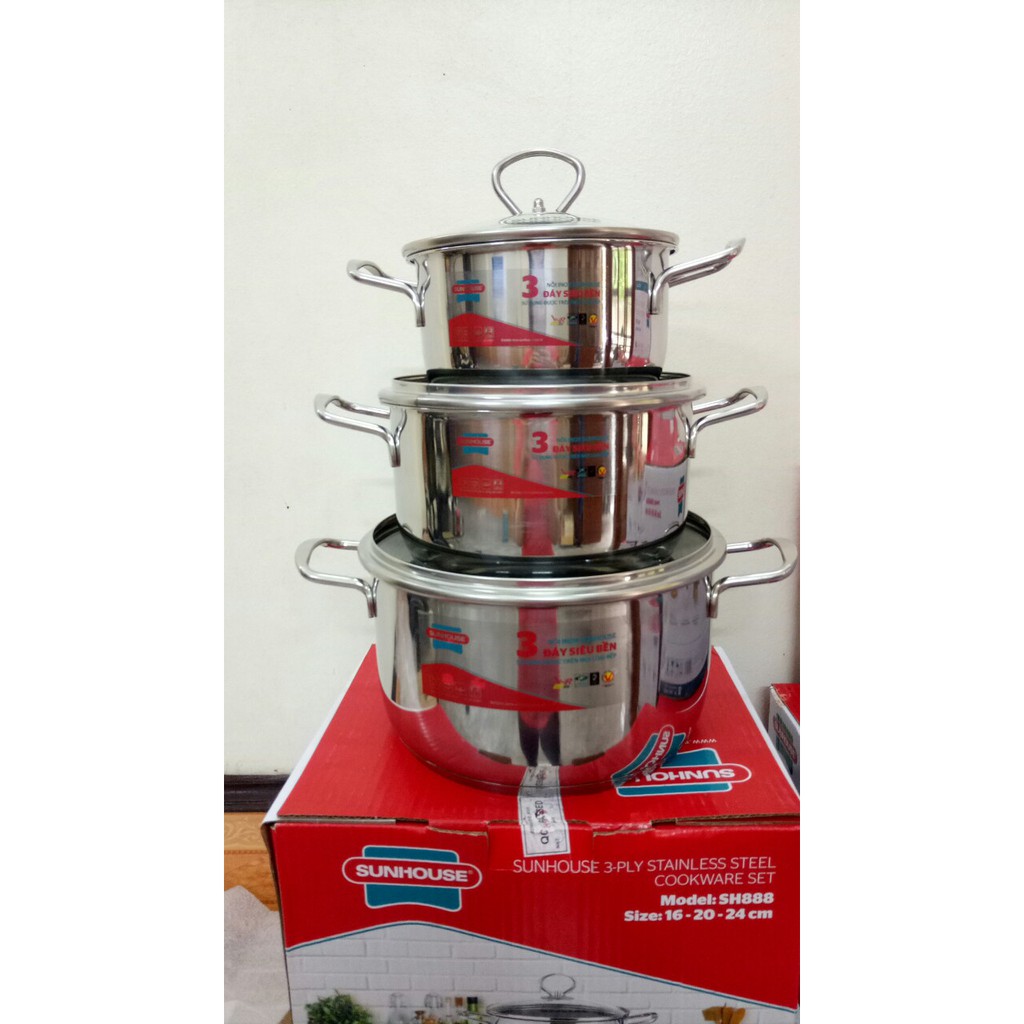 ️--------------------------------------THÔNG TIN SHOP------------------------------------------: Shop chuyên sỉ lẻ hàng thời trang giá tận xưởng, hàng gia dụng- khuyến mại uy tín, chất lượng, giá cạnh tranh. CAM KẾT SẢN PHẨM Y HÌNH, sẵn sàng nhận lại hàng nếu khách không ưng. ĐC: sn 28, ngõ 2, phố Bồ Xuyên, Thành phố Thái Bình. ĐT: 033.700.6426 ----------------------------------------------------------------------------------------------------------------------------------------------------------------------------------------------------------- ✌️Thông tin sản phẩm: ?Bộ nồi inox 3 đáy cao cấp, bộ 3 nồi. ?Đường kính: 16cm-20cm-24cm ?Quai được thiết kế chắc chắn, lực đỡ cao gấp 2 - 3 lần nồi thông thường. ?Công nghệ viền mép nồi. Vung nồi được làm bằng kính cường lực ?GIỚI THIỆU ?Chất liệu inox cao cấp Bộ nồi inox Sunhouse VK-SH888 có thân được làm bằng inox cao cấp, đạt tiêu chuẩn vệ sinh và an toàn cho sức khỏe. Chất liệu đảm bảo không thôi nhiễm những chất độc hại ngay cả khi đun ở nhiệt độ cao. Ngoài ra, inox còn rất dễ vệ sinh và chùi rửa đồng thời giữ độ sáng bóng dài lâu cho bộ sản phẩm. ?Đáy 3 lớp tiện dụng Bộ nồi inox Sunhouse VK-SH888 có 3 lớp đáy của nồi mang hiệu quả giữ nhiệt lâu và tăng độ bền cho sản phẩm nhanh chóng mang đến những bữa ăn ngon cho gia đình bạn. Ngoài ra, quai và núm nắp nồi bằng inox chắc chắn, lực đỡ cao gấp 2 - 3 lần nồi thông thường. ?Quai và núm nắp nồi chịu nhiệt Bộ nồi inox Sunhouse VK-SH888 có quai và núm nắp nồi chịu nhiệt, thiết kế dễ dàng cầm nắm và đảm bảo cách nhiệt để tay bạn không bị nóng khi nhấc nồi hay khi mở nắp. ?Bộ nồi đa dụng Bộ nồi Sunhouse SH 888 gồm 3 loại nồi có đường kính khác nhau: 16, 20 và 24cm. Các kích cỡ khác nhau sẽ đáp ứng đầy đủ nhu cầu chế biến thực phẩm cho gia đình. ✌️THÔNG SỐ KỸ THUẬT ?Bộ nồi inox 3 đáy cao cấp, bộ 3 nồi. ?Quai được thiết kế chắc chắn, lực đỡ cao gấp 2 - 3 lần nồi thông thường. ?Công nghệ viền mép nồi giúp nồi luôn chắc chắn trước sự va đập. ?Vung nồi được làm bằng kính cường lực dày 4mm, an toàn, chắc chắn. ?Bề mặt sáng bóng, vệ sinh dễ dàng. #bonoi #bonoiinox #bonoiinox3day #bonoiinoxsunhouse #bonoisunhouse #sunhouse #sh888 #bonoisunhousesieudep #bonoisunhouse3day #bonoisieuday #bo3noiinox #bonoiSH888