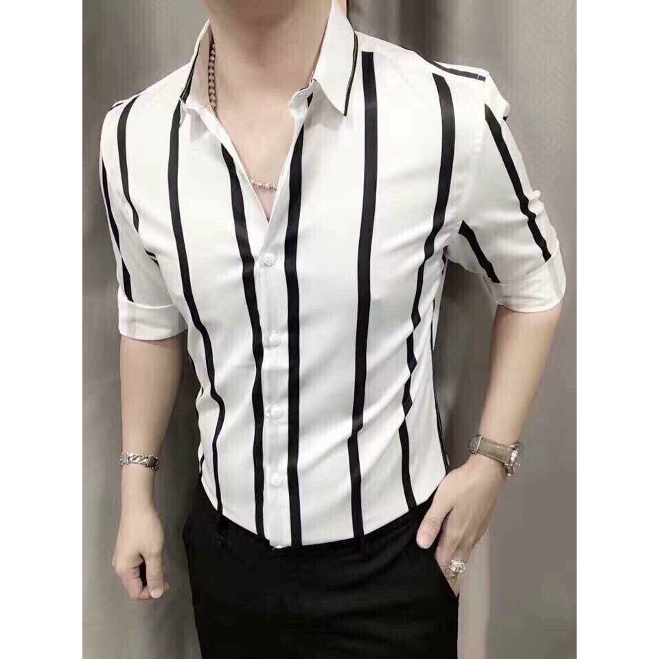 ÁO SƠ MI LỤA NAM NỮ PHỐI KẺ SỌC TRẮNG ĐEN LỚN - Dài tay
