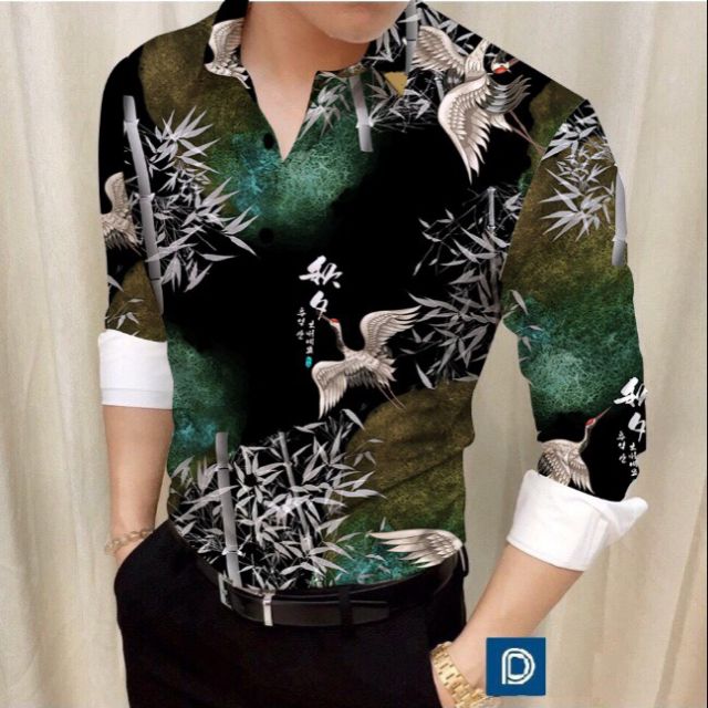 áOSơ Mi Nam Dài Tay Chất Kate Lụa Phối Họa Tiết Cò Trúc Đen - Dài tay