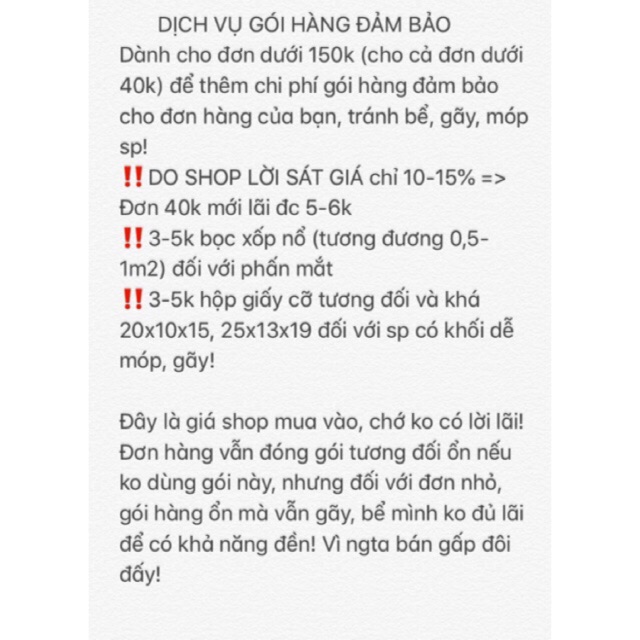 ️Dành cho đơn dưới 80k (cho cả đơn dưới 40k) để thêm chi phí gói hàng đảm bảo cho đơn hàng của bạn, tránh bể, gãy, móp sp! ?????? ➥ ngta bán cốc tạo bọt 40k, mình bán 25k lãi 3k khách hỏi sao ko đóng hộp? ➥ ngta bán phấn mắt 200k mình bán 140k khách hỏi sao quấn bọc xốp có 4-5 lớp? ?khách chỉ mua cây bút chì kẻ (lãi đc 1k ko đủ lãi mua 20cm bọc xốp) hỏi sao ko đóng hàng ko cho vào hộp, tại sao shop ko đổi trả hàng ko chịu ship? Mua gói này đơn 20k mình cũng bán, cũng đóng hộp, quấn bọc xốp thêm cả nửa mét, một mét nữa nhé. Chớ bán sát giá để rẻ, để được yêu thương mà lại bị 1 2 sao vì vỡ móp rồi khen shop ngta gói hàng cả bao hoa ticker các thứ thì mình khóc đấy! Sp dưới 80k kể cả 1k có sử dụng gói này mình đảm bảo đền 100% và hỗ trợ đổi trả nếu sp có hư bể. Kích thước hộp là tuỳ biến và tuỳ đợt, shop sẽ linh hoạt cách gói hàng cho các bạn dù các bạn chọn nhầm hộp hay là bọc xốp. Bên bán quần áo đơn vài trăm ngta cũng còn bọc mỗi cái bao nilon! ‼️DO SHOP LỜI SÁT GIÁ chỉ 10-15% => Đơn 40k mới lãi đc 5-6k ‼️3-5k bọc xốp nổ (tương đương 0,5- 1m2) đối với phấn mắt ‼️3-5k hộp giấy cỡ tương đối và khá 20x10x15, 25x13x19 đối với sp có khối dễ móp, gãy! Đây là giá shop mua vào, chớ ko có lời lãi! Đơn hàng vẫn đóng gói tương đối ổn nếu ko dùng gói này, nhưng đối với đơn nhỏ, gói hàng ổn mà vẫn gãy, bể mình ko đủ lãi để có khả năng đền! Vì ngta bán gấp đôi đấy!