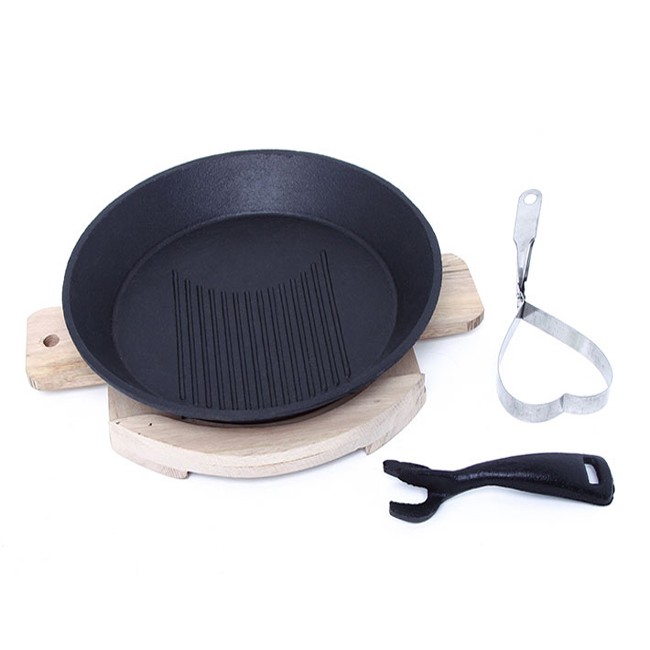 ️- Chảo gang chống dính được làm từ chất liệu gang bền bỉ, lòng chảo được tráng một lớp chống dính, không làm dính nguyên liệu khi sử dụng, đặc biệt không ảnh hưởng đến mùi vị thức ăn. - Bộ sản phẩm bao gồm 01 chảo, 01 lót gỗ, 01 gắp, 1 khuông tạo kiểu giúp bạn chế biến món bít tết thơm ngon hấp dẫn hay nướng thịt mà không cần dầu mỡ. - Thiết kế tay gắp tiện lợi giúp bạn di chuyển chảo một cách dễ dàng, tránh bỏng tay. - Lót gỗ dùng để lót bên dưới chảo, nhằm hạn chế tác động của hơi nóng đến bề mặt bàn. - Với khuông tạo kiểu tiện lợi giúp món ăn thêm đẹp mắt, hấp dẫn. Thông tin sản phẩm: - Tên sản phẩm: Bộ chảo gang chống dính bít tết với kiểu thiết kế mới - Bao gồm: 01 chảo, 01 lót gỗ, 01 gắp, 1 khuông tạo kiểu - Màu sắc: Đen + màu gỗ - Chất liệu: Gang + gỗ - Kích thước: + Chảo: đường kính 24.5cm + Lót gỗ: 30 x24.5 x2.7cm - Trọng lượng: 2057 gram - Xuất xứ: Việt Nam