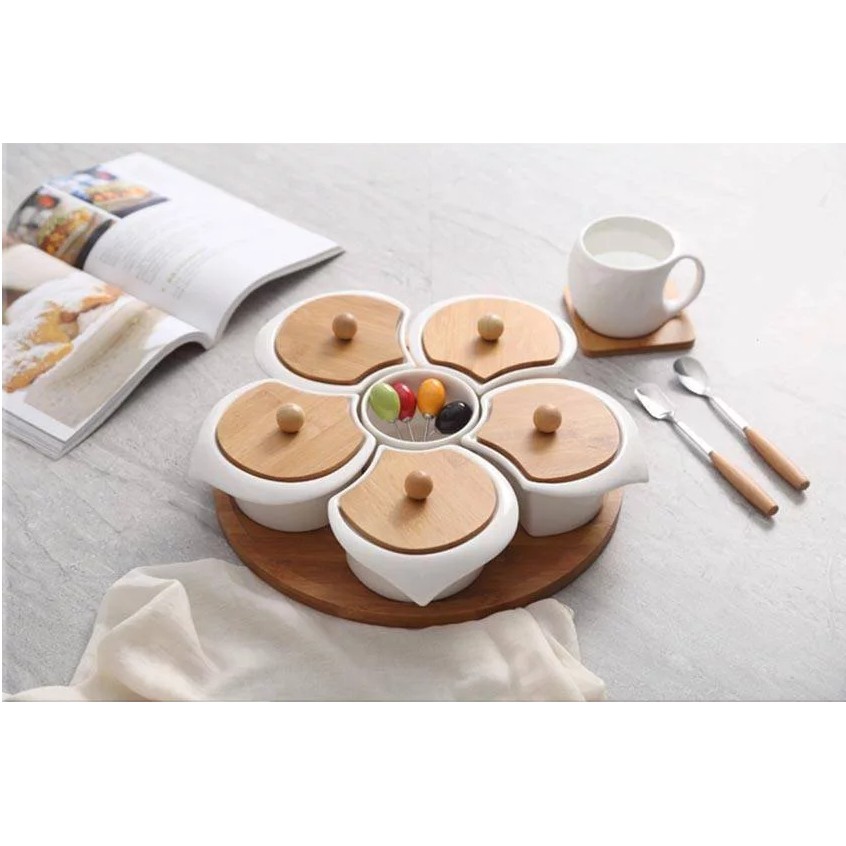 ️Sự kết hợp hoàn hảo giữa gốm sứ cao cấp nhập khẩu hoàn toàn và gỗ thơm tự nhiên đem lại sự tinh tế, nổi bật và khác biệt hoàn toàn so với những sản phẩm khay đựng thông thường. Một chiếc khay nhỏ với thiết kế độc đáo, ấn tượng để đựng bánh kẹo, hoa quả... là một phần không thể thiếu trong phòng khách ấm cúng của mỗi gia đình. Hãy đặt mua ngay cho tổ ấm của bạn 1 bộ khay sứ cao cấp này để bày bánh kẹo ngày Tết. Chắc chắn bạn sẽ hài lòng với chất lượng mà nó mang lại! Chất liệu: gốm sứ cao cấp, gỗ thơm tự nhiên Bộ sản phẩm bao gồm: 1 – khay gỗ; 1 – hũ đựng dĩa; 4 – dĩa nhỏ; 5 – hũ sứ và 5 – nắp đậy bằng gỗ Kích thước: kích thước của từng sản phẩm Khay gỗ đường kính 29,4cm Dĩa nhỏ dài 8cm Hũ tròn đựng dĩa (D x R): 8 x 5,5cm Hũ sứ (D x R): 13 x 7cm