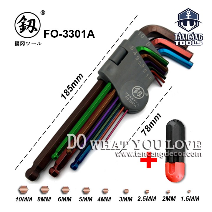 ️* Mô Tả Sản Phẩm : - Thương Hiệu : FUKOUKA - Sản xuất tại Trung Quốc theo tiêu chuẩn công nghệ JIS của Nhật Bản - website : http://www.fukuokatool.com.cn/ - Mã Sản Phẩm : F0 - 3301A - Màu Sắc : Màu Xám. - Chất Liệu : Thép Hợp Kim Crom Vanadi chất lượng cao. - Bộ sản phẩm bao gồm : 9 chi tiết lục giác 1.5 - 2 - 2.5 - 3 - 4 -5 - 6 - 8- 10 và được tặng 1 tay nối nhựa. - Trọng Lượng : 245 Gram. - Kích Thước : Đính kèm hình bên dưới. - Thiết kế 1 đầu dạng đầu bi có thể xoay chuyển góc 25 độ. - Thông số kĩ thuật được khắc Lazer. - Bộ sản phẩm được phủ 1 lớp dầu chống rỉ. * Tính Năng Sản Phẩm : - Bộ lục giác đầu bi 9 cây với kiểu đầu lục giác khác nhau giúp cho công việc sửa chữa lắp đặt máy móc của bạn trở nên dễ dàng hơn rất nhiều, đảm bảo mở được tất cả các linh kiện. Các đầu lục giác được xếp gọn gàng tiện dụng và khoa học, chỉ cần một thao tác đơn giản, bạn sẽ chọn được ngay đầu lục giác cần sử dụng. - Bộ sản phẩm còn được trang bị kèm tay nối giúp tăng lực khi vặn các chi tiết có độ cứng cao.
