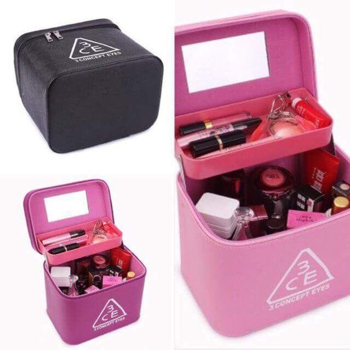 ️Cốp đựng đồ trang điểm mỹ phẩm 3CE , chất liệu da bên trong bằng nhung có gương soi. Cốp được thiết kế vô cùng sang trọng và tinh tế rất thích hợp cho bạn dùng khi đi xa hay đi công tác cần mang theo đồ trang điểm mỹ phẩm cần thiết của mình. Với 2 mâm bên hông chiếc thùng đựng đồ trang điểm giúp bạn đựng và phân loại mỹ phẩm được tiện dụng hơn khi sử dụng. Do đó, bạn có thể đựng được rất nhiều các món đồ cá nhân của mình. Phía dưới đáy hộp là một khoang rộng đựng các chai lọ mỹ phẩm có kích thước lớn hơn một chút vẫn có thể đựng được >> Hộp có tay xách tiện lợi và thời trang nên bạn có thể mang theo bên mình được thuận tiện hơn. Chất liệu nhung bên trong hộp đựng đồ trang điểm giúp cho việc giữ gìn và bảo vệ các món đồ trang điểm của bạn được tốt hơn. Ngoài ra, cốp trang điểm 3ce này còn có gương bên trong giúp bạn có thể dễ dàng nhìn ngắm và trang điểm khi cần ở mọi lúc mọi nơi bạn muốn. Thật là tiện dụng và dễ dàng phải không nào➥ Đây là dòng sản phẩm chính hãng của 3CE nên đảm bảo về vấn đề chất lượng tốt mẫu mã đẹp và giá cả rất phù hợp >> Những món đồ bạn có thể đựng trong cốp mang theo đó là bông tẩy trang, nước hoa, dụng cụ trang điểm, mỹ phẩm, xịt khoáng, son môi và các món đồ cá nhân của bạn >> Chiếc cốp này rất thích hợp cho những bạn gái đang theo đuổi học trang điểm chuyên nghiệp với số lượng đồ trang điểm còn ít hay những bạn gái thường xuyên phải đi công tác và du lịch xa cần mang theo các món đồ cần thiết để làm đẹp >> Kích thước hộp trang điểm 3CE dài 29cm * rộng 20cm * cao 23,5cm