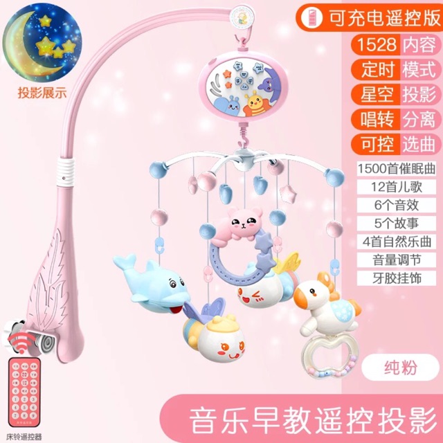 ️Đồ chơi cho bé - có thể gắn lên thành giường mà không phải khoan hay buộc - có 2 màu như hình : xanh và hồng - 1 bộ bao gồm : 5 đồ chơi, 1 hộp nhạc, 1 trục quay, 1 cần gắn , 1 hộp sạc pin, 3 viên pin sạc, 1 điều khiển và 1 tô vít