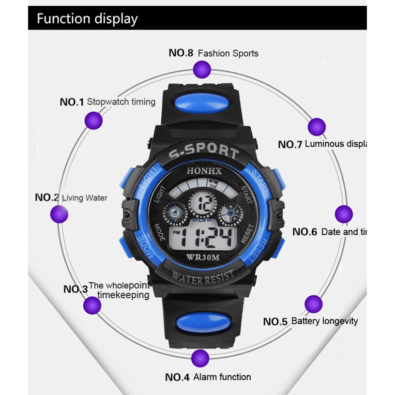 ️Note: This table wear in children under 9 years Watch property: Movement: Digital Style: Sport Surface Material: Acrylic Dial Material: Acrylic Display: Digital Strap Material: Silicone Features: 100% Brand new High Quality Fashion Sports style Life Waterproof The whole point timekeeping Alarm function Date and Time Stopwatch timing Luminous display Long-life battery Specification: Dial diameter: 37mm Case Thickness: 15.36mm Strap width: 2.5mm Strap Thickness: 2mm Watch NW: 37.1g Full length: 23.6cm Color: Red, Yellow, Black, Blue, Orange Package Content: 1 x Sports Watch