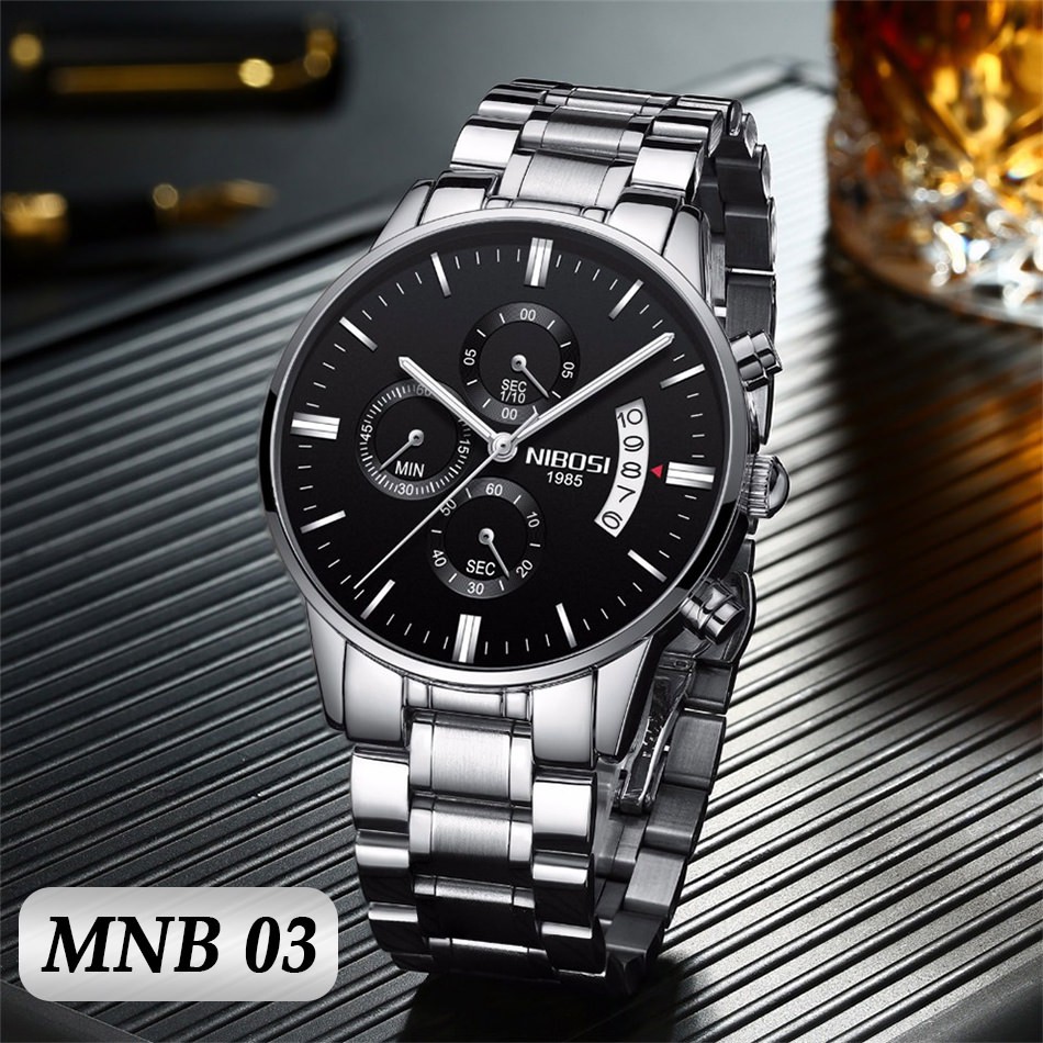 ️THÔNG SỐ KỸ THUẬT Thương hiệu: NIBOSI Kiểu máy: Quartz Dành cho: Nam Chất liệu vỏ: Thép chống gỉ Chất liệu mặt trước: Kính Mineral chịu lực Chất liệu dây: Dây thép lụa chống gỉ Kích thước mặt:40mm x 10mm Độ dày mặt:8mm Số kim: 6 Độ chịu nước:5ATM Năng lượng sử dụng: Pin Bảo hành:Bảo hành đồng hồ 6 tháng GỢI Ý SỬ DỤNG VÀ BẢO DƯỠNG Nên tránh: - Va chạm và tiếp xúc với chất ăn mòn, nhiệt độ cao hoặc từ trường mạnh. - Sử dụng bất kì dung môi, chất làm sạch, chất tẩy công nghiệp, chất dính, sơn hoặc các chất xịt mỹ phẩm. - Đeo đồng hồ cùng các vòng đeo tay vì dễ tạo vết xước hay làm hỏng mặt đồng hồ. - Chỉnh nút chỉnh giờ khi đồng hồ bị ướt. - Để đồng hồ nơi nhiệt độ thay đổi đột ngột. - Sử dụng, nhấn các nút hoặc cài đặt ở dưới nước. Nên làm: - Làm sạch đồng hồ theo định kỳ vải mềm hơi ẩm để gia tăng tuổi thọ đồng hồ. - Nếu xuất hiện hơi nước ngưng tụ, cần mang đồng hồ đến Trung Tâm Dịch Vụ Khách Hàng của các hãng càng nhanh càng tốt để giảm thiểu hư hỏng bên trong. - Thay pin khi đồng hồ chạy sai giờ hoặc chuyển động kim giây không đều vì rò rỉ điện do pin chết có thể gây ra hỏng hóc nghiêm trọng cho đồng hồ. - Tắt nguồn khi không được sử dụng trong thời gian dài, để kích hoạt công tắc bảo quản nguồn đặc biệt và tránh hao pin.