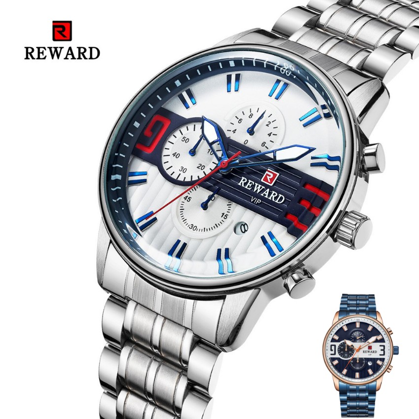 ️◈ THÔNG TIN NỔI BẬT: - Brand: REWARD - Model: KT63077 - Xuất xứ: (Công nghệ Nhật Bản, Lắp ráp tại HongKong) - Kiểu máy: Quartz, máy Nhật - Chống nước: 3 ATM (Có khả năng chống nước sinh hoạt, đi mưa, không nên bơi, ngâm nước) - Chất liệu mặt trước: kính tráng sapphire MĐ1 , chống va đập, chống trầy - Chất liệu dây đeo: Thép không gỉ Dây - Chất liệu: Vỏ hợp kim - Đường kính quay số: 46mm - Độ dày mặt: 12mm - Chiều dài dây đeo: 240mm - Chiều rộng dây đeo: 24mm - Trọng lượng: 138 gram - Kiểu khóa: Gấp khóa - Loại hiển thị: Kim Đồng Hồ Lịch Dạ Quang QUY ĐỊNH BẢO HÀNH ✔ Đổi trả trong 7 ngày nếu hàng bị lỗi do nhà sản xuất như là hết pin, rớt kim, hư khóa, đồng hồ không chạy. ✔ Bảo hành pin và máy trong 12 tháng. Bị bất cứ vấn đề gì bạn cứ inbox shop sẽ luôn tư vấn và hỗ trợ bạn. ◈ BỘ SẢN PHẨM BAO GỒM ✔ Đồng hồ chính hãng 100% ✔ Hộp đồng hồ cực kì đẹp, sang trọng (rất thích hợp làm quà tặng) ✔ Thẻ bảo hành, hướng dẫn sử dụng, bảo quản sản phẩm ◈ NHỮNG CAM KẾT KHI MUA HÀNG CỦA SHOP Chào mừng bạn ghé thăm cửa hàng REWARD VIET NAM: ✔ Phân phối chính thức, cam kết 100% chính hãng REWARD ✔ Cam kết về sản phẩm: Sản phẩm này 100% hàng chính hãng và giống y hệt ảnh, nếu nhận hàng khách không ưng ý hãy liên hệ với shop nhé, shop cam kết sẽ nhận lại hàng và hoàn tiền ngay. ✔ Hoàn 200% nếu phát hiện hàng giả. ✔ Bảo hành 12 tháng. (Bằng hóa đơn điện tử) ✔ Không nhập hàng loại 1 giá rẻ, loại khắc thương hiệu REWARD . (loại này rất khó phân biệt, tỷ lệ lỗi máy, nóng máy hay hao pin sau một thời gian sử dụng rất cao) ✔ Uy tín bán hàng được đặt lên hàng đầu, không kinh doanh chộp giật. ✔ Chúng tôi nói không với hàng giá rẻ kém chất lượng, shop chỉ nhập duy nhập hàng cao cấp, sản phẩm của shop có chất lượng cao. ✔ Tất cả sản phẩm đều được kỹ thuật kiểm tra đạt chuẩn trước khi giao cho khách, bạn hoàn toàn có thể yên tâm sử dụng hay làm quà tặng. Hãy mua thử sản phẩm của chúng tôi, hài lòng hãy mua tặng người thân bạn bè. Nó thật sự là một món quà đặc biệt và quý giá. THÔNG TIN THƯƠNG HIỆU Founded in 2001, the brand, REWARD, has its own extended meaning as feedback and reciprocation, with its founder Mr. Liu’s years of dedication into the watch industry and unique understanding and comprehension of the watch. Since its establishment, the REWARD brand has been adhering to the design style of elegance, simplicity and decency. REWARD watches have stood out in the forefront of fashion, for the spirit of persistent pursuing of perfection and advanced insights into vogue. The almost demanding perseverance in quality and the almost obsessive desire for individuality and freedom make the REWARD wristwatch always have a unique love for innovation, thus making the REWARD wristwatch unique and well-known in the industry.