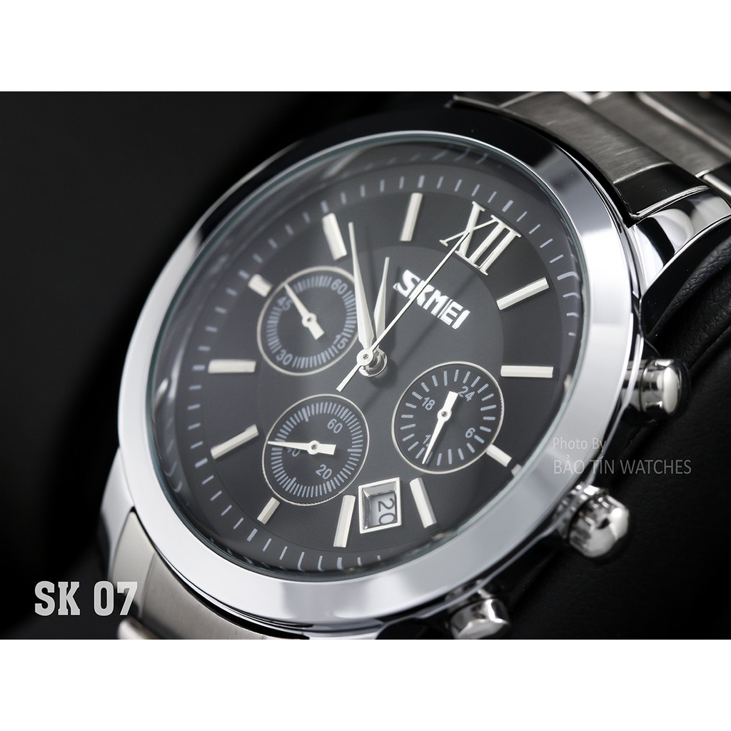 ️CHÚNG TÔI CAM KẾT: ✔ MẪU MÃ, CHẤT LƯỢNG sản phẩm giống như mô tả (hình ảnh, video là do shop tự quay, tự chụp) ✔ Chính sách ĐỔI TRẢ, HOÀN TIỀN nếu có lỗi nhà sản xuất hoặc không như mô tả. ✔ KIỂM TRA hàng trước khi thanh toán ✔ BẢO HÀNH 6 tháng, có thẻ bảo hành ✔ Nhận hàng NHANH CHÓNG -------------------------------------------------- THÔNG SỐ KỸ THUẬT Thương hiệu: SKMEI Kiểu máy: Quartz Dành cho: Nam Chất liệu vỏ: Thép chống gỉ cao cấp Chất liệu mặt trước: Kính Mineral chịu lực Chất liệu dây: Thép chống gỉ cao cấp Kích thước mặt: 40mm Độ dày mặt: 10mm Số kim: 6 , có ngày Độ chịu nước: 5ATM Năng lượng sử dụng: pin Bảo hành:Bảo hành đồng hồ 6 tháng -------------------------------------------------- GỢI Ý SỬ DỤNG VÀ BẢO DƯỠNG Nên tránh: - Va chạm và tiếp xúc với chất ăn mòn, nhiệt độ cao hoặc từ trường mạnh. - Sử dụng bất kì dung môi, chất làm sạch, chất tẩy công nghiệp, chất dính, sơn hoặc các chất xịt mỹ phẩm. - Đeo đồng hồ cùng các vòng đeo tay vì dễ tạo vết xước hay làm hỏng mặt đồng hồ. - Chỉnh nút chỉnh giờ khi đồng hồ bị ướt. - Để đồng hồ nơi nhiệt độ thay đổi đột ngột. - Sử dụng, nhấn các nút hoặc cài đặt ở dưới nước. Nên làm: - Làm sạch đồng hồ theo định kỳ vải mềm hơi ẩm để gia tăng tuổi thọ đồng hồ. - Nếu xuất hiện hơi nước ngưng tụ, cần mang đồng hồ đến Trung Tâm Dịch Vụ Khách Hàng của các hãng càng nhanh càng tốt để giảm thiểu hư hỏng bên trong. - Thay pin khi đồng hồ chạy sai giờ hoặc chuyển động kim giây không đều vì rò rỉ điện do pin chết có thể gây ra hỏng hóc nghiêm trọng cho đồng hồ. - Tắt nguồn khi không được sử dụng trong thời gian dài, để kích hoạt công tắc bảo quản nguồn đặc biệt và tránh hao pin.