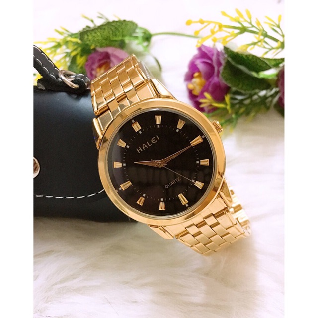 "FULL BOX" ĐỒNG HỒ NAM NỮ HALEI DÂY VÀNG MẶT ĐEN CHỐNG NƯỚC CHỐNG XƯỚC