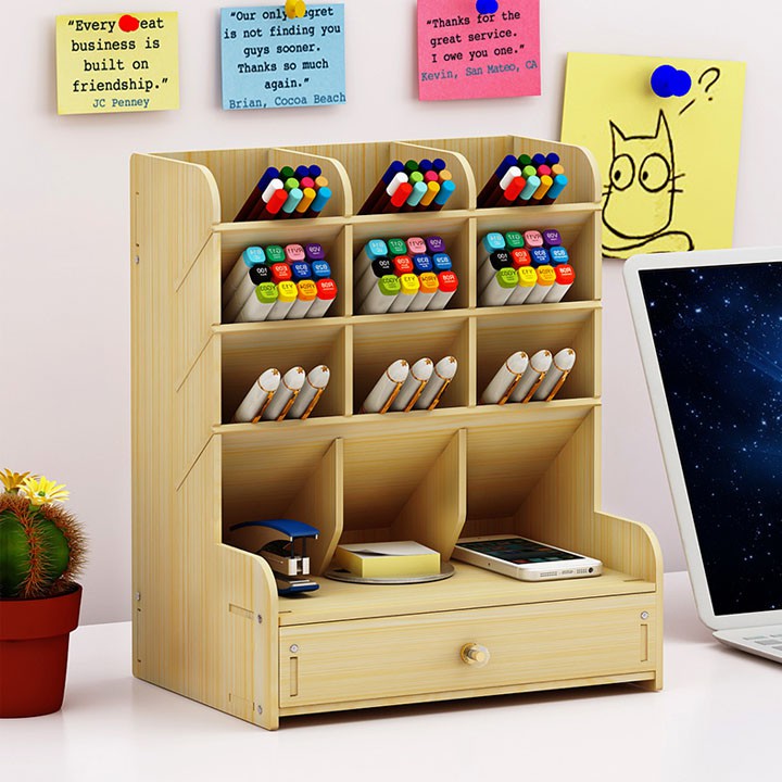 ️Giá kệ gỗ đựng đồ dụng học tập và văn phòng phẩm để bàn cho học sinh Giá Kệ gỗ lắp ghép đa năng nhiều ngăn bàn làm việc. Có nhiều màu sắc tiện dụng và dễ trang trí. Sản phẩm Kệ giá gỗ đựng đồ dùng học tập và văn phòng phẩm đa năng phù hợp sử dụng trong nhiều không gian: Bàn làm việc, bàn học, quầy thu ngân, văn phòng.... Không tốn diện tích như những sản phẩm Kệ gỗ cùng loại khác, sản phẩm có kích thước nhỏ gọn, chia nhiều ngăn thích hợp với những văn phòng, phòng học có không gian nhỏ, chật hẹp không thể bày được kệ ngăn kéo lớn. Sản phẩm được thiết kế chuyên dụng để đựng văn phòng phẩm, đồ dùng học tập như: Bút thước, bộ màu vẽ, con dấu, bấm ghim.... Được chia nhiều ngăn riêng biệt giúp bạn có thể dễ dàng chia cất giữ đồ đạc để tiện khi sử dụng mà không mất nhiều công tìm kiếm như trước. Đặc biệt có thể sử dụng ở các lớp học vẽ, trang điểm, hóa trang để phân loại các bảng màu, đồ make up, đồ phụ kiện nhỏ dễ thất lạc.... Sản phẩm bằng chất liệu gỗ ép, bền chắc dễ lắp ghép có 3 màu sắc cho bạn lựa chọn theo sở thích: đen - kem - nâu gỗ. Kích thước kệ: 21 cm x 15 cm x 25.5 cm Nếu còn băn khoăn về sản phẩm vui lòng liên hệ "Chat ngay" với gian hàng để chúng tôi cung cấp ảnh thật sản phẩm và tư vấn mọi thắc mắc của bạn. LÀ "Shop Yêu Thích" được Shopee bình chọn và Khách Hàng tin tưởng - Chúng tôi cam kết cung cấp cho Khách Hàng: ✅ Sản phẩm đúng mẫu - đúng chất lượng - đúng giá. ✅ Với mọi lỗi kĩ thuật hoặc phát sinh của sản phẩm chúng tôi ĐỔI - TRẢ - BẢO HÀNH cho Khách Hàng hoàn toàn MIỄN PHÍ. ✅ Cung cấp đầy đủ ẢNH THẬT - THÔNG TIN SẢN PHẨM - VIDEO SẢN PHẨM để đảm bảo sản phẩm tới tay khách hàng. Vui lòng Chat với shop để được hỗ trợ A - Z. ✅ Nếu bạn còn bất kì câu hỏi nào về ưu đãi sản phẩm, thanh toán đơn hàng hoặc giải đáp thắc mắc. Vui lòng liên hệ với shop hoặc để lại thông tin liên hệ để chúng tôi tư vấn cho bạn. SỰ HÀI LÒNG CỦA BẠN LÀ UY TÍN CỦA CHÚNG TÔI!