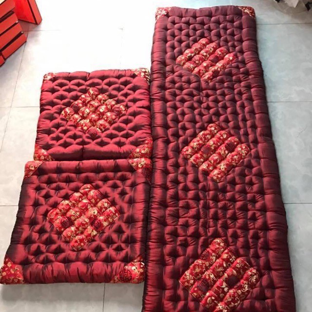️Bộ đệm ghế gấm đỏ gồm 2 tấm vuông 50x50, 1 tấm dài 165x50cm Chất liệu lụa bóng Sản phẩm được sản xuất thủ công 90% Lh