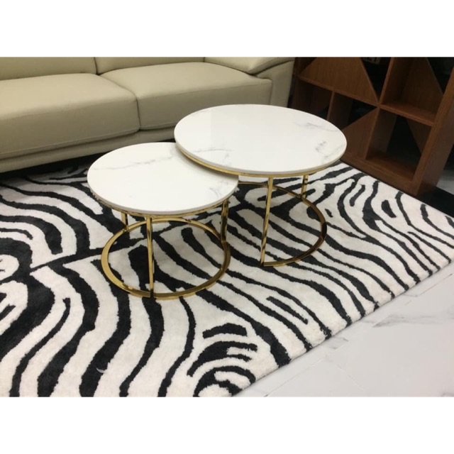 ️Bàn trà đôi mặt đá kích thước D70-50 Màu sắc: trắng - đen - vàng ( khung ) Chất liệu: khung sắt sơn tĩnh điện Mặt bàn là đá vân trắng