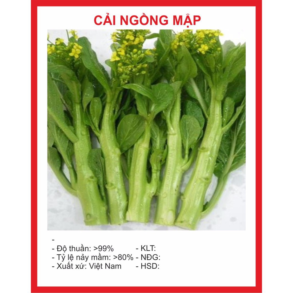 ️- SHOP Hạt giống - Mua sắm thả ga, giá cả tốt nhất ! - Giao hàng TOÀN QUỐC - Thanh toán khi nhận hàng COD ---------------------------------------------- * GIỚI THIỆU SẢN PHẨM - Số hạt/gói: 20gram - Tỷ lệ nẩy mầm: >80% - Mùa Vụ: Thu Đông Xuân - Nhiệt độ gieo: 15 - 25 độ - Nhiệt độ ST: 10 - 35 độ - Thời gian thu hoạch: 30 - 40 ngày ---------------------------------------------- * HƯỚNG DẪN TRỒNG ĐƠN GIẢN 1. Chuẩn bị vật dụng - chất trồng: -Chậu nhỏ (hoặc chậu to nếu sau này không muốn thay chậu nữa) hoặc khay ươm nếu gieo số lượng nhiều. Dù bạn dự tính trồng thẳng trong chậu hoặc sẽ chuyển xuống đất trồng thì cũng nên uơm hạt trong chậu trước vì dễ quản lí đô ẩm, sâu bệnh, dinh dưỡng... -Thuốc trừ nấm. -Đất sạch giàu dinh dưỡng + vỏ trấu hoặc xơ dừa, mụn xơ dừa, (đã hoai mục), phân gà, phân bò... Thông thường tỷ lệ phổ biến như sau: Đất sạch - vỏ trấu, xơ dừa, phân gà, bò = 7 : 3 - Hoặc có thể dùng đất sạch đóng bao sẵn – mua ở cửa hàng 2. Tiến hành gieo hạt:. -Chất trồng sau khi trộn đều, chúng ta cho vào chậu hoặc khay uơm. -Phun thuốc trừ nấm lên mặt chất trồng (bước này khá quan trọng), tốt nhất phun liên tục 2-3 lần để thuốc thấm xuống sâu hơn. (nếu mua đất sạch thì không cần) -Ngâm hạt:Ngâm hạt trong nước 3 sôi 7 lạnh trong 5-7h -Sau khi ngâm hạt dùng giấy ướt (có thể dùng giấy vệ sinh gấp lại thành nhiều lớp) để ủ hạt (cho hạt vào giấy, và gấp đôi chúng lại), sau đó cho vào 1 hộp nhỏ, rồi đậy kín lại và cho vào chỗ mát mẻ (luôn để giấy ở trạng thái ẩm cao). Để như vậy đến khi hạt nhú mầm xanh(tùy hạt mà từ 5-15 ngày) thì mang gieo ra đất đã được làm tơi xốp – nhớ làm nhẹ tay kẻo gẫy mầm nhé! (thường áp dụng cho các loại hạt yêu cầu kĩ thuật xíu:hạt giống hoa các loại, dâu tây, nho, hồng ri ba tư, nho gỗ, tử đằng... 3. Chăm sóc sau khi gieo hạt: -Nhiệt độ:tùy loại mà nhiệt độ để nẩy mầm dao động từ khoảng 20-30oC. Không cần quá chú trọng đến vấn đề này vì chỉ cần che lưới là ổn rồi. -Độ ẩm của đất trồng:luôn đảm bảo độ ẩm cho đất, không được để đất bị khô hoặc quá ẩm -Đặt chậu hoặc khay uơm ở nơi có ánh sáng khuyếch tán (che lưới lan màu đen loại 50%), vì hạt cần ánh sáng để nẩy mầm, nhưng nếu cường độ quá mạnh sẽ đốt cháy hạt và làm khô chất trồng nhanh chóng -Thay chậu hoặc chuyển vào đất trồng: khi cây con đã lớn (thân đủ cứng cáp, rễ mạnh...), chúng ta có thể chuyển qua chậu to hơn hoặc chuyển xuống đất trồng trực tiếp. Nếu trước đó đã gieo hạt trong chậu to thì không cần sang chậu. ------------------------------------------------------------------------------------------ SDT:0898.319.473 ----------------------------------------------------------------------------------------- #Câycảnhvàhạtgiống #caycanhvahatgiong #hatgiong #hạtgiống #caingongmap #cảingồngmập