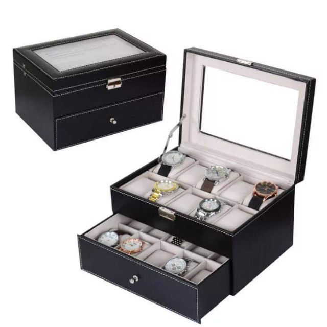 ️Hộp được bọc da PU màu đen bên ngoài, bên trong lót một lớp nỉ nhung sang trọng. Hộp được chia làm 2 ngăn và đựng được tới 20 chiếc đồng hồ