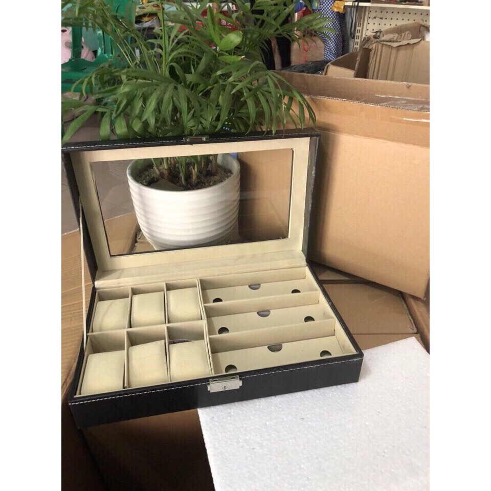 ️T2 về hàng khách gom nhé) :four_leaf_clover: #Hộpđồnghồ và kính được làm bằng chất liệu khung gỗ bọc simili cao cấp. Bên trong bọc nhung ko xù lông. :four_leaf_clover:Hộp thiết kế sang trọng, cao cấp, chắc chắn với 6 ngăn đựng đồng hồ và 3 ngăn đựng kính mắt - Kích thước : 33 x 20 x 8cm - Nặng : 1,4 kg - Có 2 màu: đen và nâu, thùng 10c