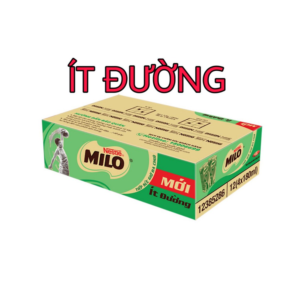 ️Thức uống lúa mạch Nestlé® MILO® ít đường với hợp chất ACTIV-GO Vươn Xa là sự kết hợp độc đáo của PROTOMALT® - chiết xuất từ mầm lúa mạch - và tổ hợp các vitamin cùng khoáng chất thiết yếu, đóng vai trò quan trọng trong việc giải phóng năng lượng, tăng cường chức năng cơ và hệ xương, hỗ trợ tích cực cho các hoạt động thể chất và não bộ của trẻ. Hương vị MILO thơm ngon với sự hòa quyện của cacao, sữa và lúa mạch nay đã có thêm lựa chọn ít đường phù hợp cho ý thích và khẩu vị đa dạng của các bé Uống Nestlé® MILO® ít đường giúp bổ sung năng lượng và dưỡng chất thiết yếu, cho trẻ năng động mỗi ngày! Sản xuất tại Công ty TNHH NESTLÉ VIỆT NAM, Khu công nghiệp Long Bình (Amata), phường Long Bình, thành phố Biên Hòa, tỉnh Đồng Nai, Việt Nam Nhu cầu khuyến nghị: Sử dụng sản phẩm cho trẻ từ 6 tuổi trở lên với 2 khẩu phần (180ml) MILO mỗi ngày. Cách bảo quản: Bảo quản sản phẩm nơi khô ráo, thoáng mát, tránh ánh nắng trực tiếp. Cách sử dụng: Lắc đều trước khi uống. Ngon hơn khi uống lạnh Hạn sử dụng: 8 tháng kể từ ngày sản xuất Thành phần: Nước, sữa bột tách kem (skimmed milk powder), PROTOMALT® 2,8% (chiết xuất từ mầm lúa mạch - extract from malted barley), đường, chất xơ từ bắp, chất béo sữ (milk fat), dầu thực vật, bột cacao, bột whey từ sữa (from milk), các khoáng chất (dicalci photsphat, magnesi carbonat, sắt pyrophosphat), hương tự nhiên dùng cho thực phẩm, các vitamin (B3, D, B6, B2), chất nhũ hóa 322(i) – chiết xuất từ đậu nành (soya lecithin), các vitamin (niacin, biotin, canxi pantothenat, B6, B1, B2), chất ổn định 407, chất tạo ngọt tự nhiên steviol glycosides.