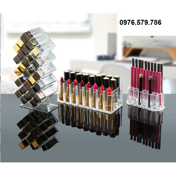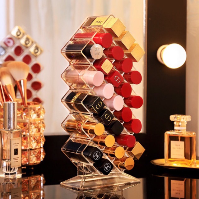 ️- Son, cọ , chì kẻ , son kem của bạn rất nhiều, để trên bàn rất hay bị đổ và lẫn lộn, có khi muốn tìm 1 cây son ưa thích nhưng lại tím mãi không thấy.. Shop mình mới nhập về 3 mẫu đựng son mới,, gồm : 1. Khay đựng son hình tháp : có thể để đứng hoặc nằm ngang,, gồm 28 ô đựng son, kích thước 12 x 6.5 x 27 cm, size mỗi ô rộng, để đc các loại son to n : TF, 3CE.. #khaydungson