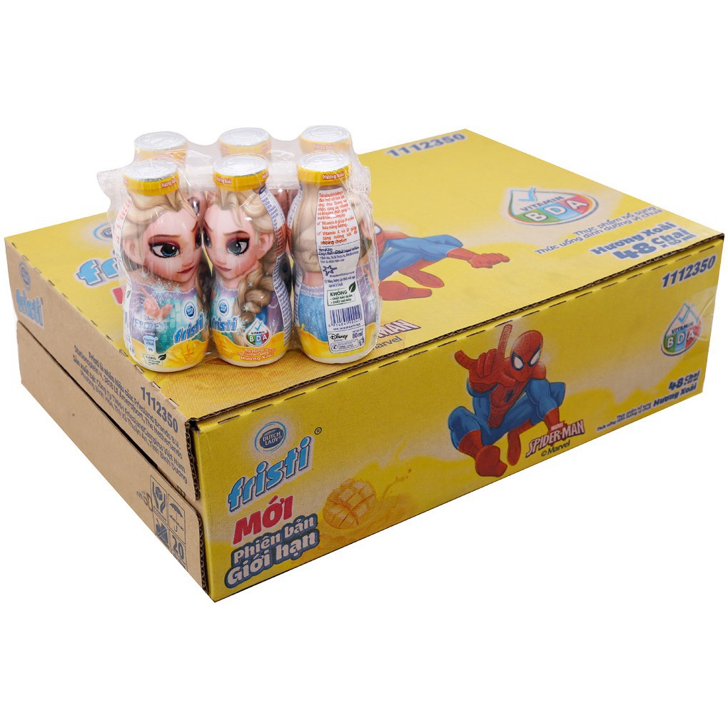 ️Sữa uống tiệt trùng Fristi được làm từ nguồn sữa tươi sạch tự nhiên, lên men, kết hợp cùng hương trái cây tự nhiên tạo nên vị chua ngọt đặc trưng, thơm ngon, hấp dẫn vị giác.. - Thành phần trong sản phẩm giúp cung cấp nhiều loại dưỡng chất cần thiết cho cơ thể như protein, canxi và vitamin, đem lại sức đề kháng cao cho các em nhỏ.. - Được sản xuất trên dây chuyền công nghệ cao, đảm bảo đáp ứng các tiêu chuẩn chất lượng và an toàn cho sức khỏe của người sử dụng.. - Sản phẩm đạt chất lượng vệ sinh thực phẩm, không chứa melamine an toàn tuyệt đối cho sức khỏe của trẻ nhỏ.. - Canxi giúp cho sự phát triển của xương và răng. Vitamin A giúp đôi mắt sáng. Vitamin B1, B3, B6, giúp tăng cường năng lượng. Sữa bò tươi, đường cát trắng, hương cam thơm ngon. Sữa tươi Fristi có nhiều hương vị như táo, cam, dâu, nho được các bé rất yêu thích.. Thông tin thương hiệu Fristi là nhãn hiệu sữa nổi tiếng thuộc Công ty FrieslandCampina của Việt Nam. Được biết đến với nhiều dòng sản phẩm như sữa tươi, sữa chua, sữa đặc,... Với cam kết góp phần cải thiện đời sống cho người tiêu dùng, an toàn vệ sinh, trong 20 năm qua được người tiêu dùng tin tưởng và sử dụng rộng rãi. Mang lại những hương vị giàu chất dinh dưỡng, giàu năng lượng – Fristi luôn không ngừng phát triển không chỉ cho ra đời những sản phẩm có mẫu mã bắt mắt, thú vị mà còn cải thiện hơn về chất lượng sản phẩm phù hợp nhất với nhu cầu của người Việt Nam. Đồng hành với những bạn nhỏ đến trường, cung cấp năng lượng cho ngày dài hoạt động nên có thể nói Fristi được rất nhiều phụ huynh lựa chọn cho con của mình. Đáp lại sự tin tưởng đó, đội ngũ nhân viên sản xuất, phân phối, đại lý,… luôn luôn mong muốn mang lại cho người dùng những sản phẩm tiêu biểu về chất lượng. Đối tượng tiêu biểu Fristi hướng đến là 6-12 tuổi với các thành phần giúp trẻ cao, khỏe, thông minh, đầy dưỡng chất. Tung ra nhiều dòng sản phẩm khác nhau, đánh đúng tâm lý người tiêu dùng điều này giúp cho Fristi nhận được khá nhiều lòng tin và sự lựa chọn của người tiêu dùng. Không ngừng phát triển, không ngừng cải thiện là những gì mà Fristi mong muốn sẽ phát triển trong tương lai ●● Sữa chua uống lên men FRISTI ****Có 4 hương vị: dâu, cam, nho, táo,xoài. Quy cách đón gói: 1lốc 6 chai 80ml Thức uống dinh dưỡng vị chua Fristi với hình ảnh siêu anh hùng & công chúa vui nhộn cùng với các vitamin và khoáng chất giúp bé vui khỏe mỗi ngày +Vitamin B giúp chuyển hóa năng lượng +Vitamin A & D giúp tăng cường sức đề kháng cho bé +Sản xuất tại Việt Nam. +HSD 6 tháng kể từ ngày sản xuất
