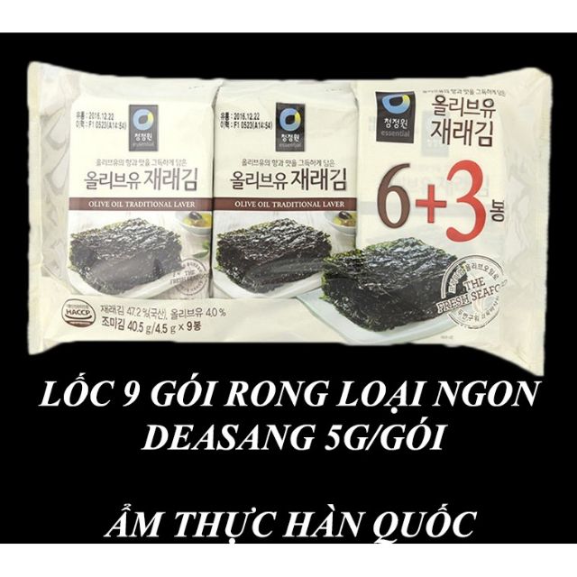 + LỐC 9 GÓI RONG BIỂN ĂN LIỀN DEASANG LOẠI NGON 5G/GÓI được chế biến cùng với dầu mè, dầu olive,… được xử lý qua công nghệ hiện đại nên vẫn giữ nguyên được hương vị thơm ngon của món quà biển.
