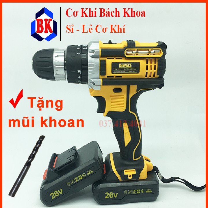 ️Máy khoan Pin Dewalt 26V 3 Chức Năng ( Có Búa) TẶNG MŨI KHOAN ✔️ Thông số kỹ thuật - Nguồn: 2 pin 26V Li-ion 2000mAh - Mô men xoắn cực đại :32Nm - Tốc độ không tải : 0-650v/phút ở tốc độ 2, 0-2200v/phút ở tốc độ 1 - Đầu cặp nhanh :10mm - Trọng lượng máy :1.5kg - Chức năng : khoan tường, khoan sắt, khoan gỗ, khoan vít tôn - Sản xuất :Liên doanh Việt - Nhật - Bảo hành 06 tháng - Trọng lượng máy :1.5kg ✔️ Bộ sản phẩm gồm - 1 máy khoan Dewalt 26V - 1 dây sạc - 2 Pin - 1 hộp đựng - TẶNG 2 mũi bắt vít và kẹp pin ✔CHỨC NĂNG: + Máy khoan pin được trang bị động cơ cực khỏe đặc biệt có chế độ khoan búa nên có thể khoan mọi bề mặt: khoan gỗ, khoan tường, khoan bê tông, khoan kim loại,... + DUNG LƯỢNG PIN CỰC KHỦNG: Pin của máy khoan pin được cải tiến với công nghệ sạc nhanh, và cải thiện được thời gian sử dụng lên nhiều giờ đồng hồ. Bên cạnh đó sản phẩm được TẶNG KÈM 1 viên pin dự phòng==>> Không còn nỗi lo về thời gian sử dụng. + THIẾT KẾ PHÙ HỢP: Thân máy khoan được làm từ chất liệu cao cấp, đầu khoan bọc thép ==>> kéo dài độ bền, cũng như hạn chế va chạn đến động cơ máy khoan bên trong. Vỏ ngoài Máy được làm bằng nhựa và tay cầm được bọc một lớp cao su tạo độ nhám cao giúp chống trượt, chịu nhiệt và cách điện. Thiết kế này vừa tạo cảm giác chắc chắn, êm tay, vừa đảm bảo an toàn cho bạn kể cả khi bị ra mồ hôi tay hay tay bạn đang bị dính dầu nhớt trong lúc làm việc.