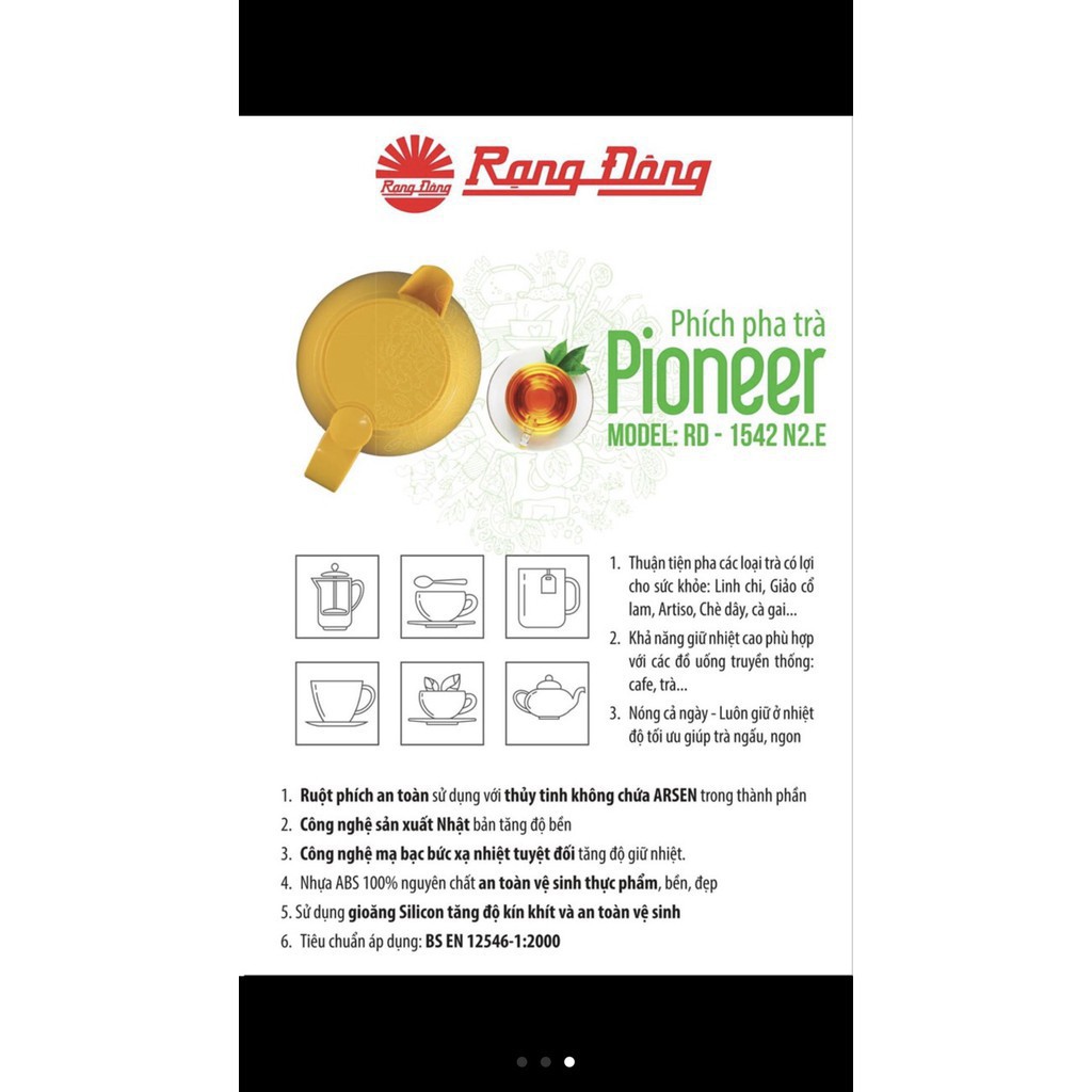 ️* Model: RD 1542 N2.E - Dung tích: 1,5 lít - Vật liệu: vỏ nhựa ABS ➥ Độ giữ nhiệt cao sau 6 giờ ≥ 78°C - Gioăng: Silicon +Thuận tiện pha các loại trà có lợi cho sức khỏe: Linh chi, Giảo cổ lam, Artiso, Chè dây, cà gai... +Nóng cả ngày - Luôn giữ ở nhiệt độ tối ưu giúp trà ngấu, ngon +Ruột phích an toàn sử dụng với thủy tinh không chứa ARSEN trong thành phần +Công nghệ sản xuất Nhật bản tăng độ bền, Công nghệ mạ bạc bức xạ nhiệt tuyệt đối tăng độ giữ nhiệt. +Nhựa ABS 100% nguyên chất an toàn vệ sinh thực phẩm, bền, đẹp. *TIÊU CHUẨN: ➥ Áp dụng tiêu chuẩn Anh BS EN 12546-1:2000 ➥ Sản phẩm Phích Rạng Đông được chứng nhận phù hợp Quy chuẩn kỹ thuật vệ sinh an toàn QCVN 12-1, 2, 3:2011/BYT; QCVN 12-4:2015/BYT. Ruột Phích không chứa thủy ngân và hóa chất độc hại, an toàn cho người sử dụng ➥ Chứng nhận độc quyền về kiểu dáng công nghiệp Kiểu dáng sang trọng, hiện đại, dễ sử dụng Được Chứng nhận "Bằng độc quyền về kiểu dáng công nghiệp" ➥ Món quà ý nghĩa và sang trọng Có thể in nội dung, logo độc quyền theo yêu cầu của khách hàng để làm quà tặng ý nghĩa và sang trọng trong các ngày lễ, ngày kỷ niệm ➥ Đặc biệt: Sản phẩm được shop kiểm tra chất lượng 100% trước khi đóng gói giao hàng ➥ Hỗ trợ đổi trả miễn phí vận chuyển trong vòng 7 ngày nếu lỗi từ nhà sản xuất, đổi trả qua Shopee LƯU Ý: SHOP GIAO MÀU NGẪU NHIÊN. KHÁCH CHỌN MÀU VUI LÒNG CHAT VỚI SHOP HOẶC ĐỂ LẠI GHI CHÚ KHI ĐẶT HÀNG. TRÂN TRỌNG! ⚙️ Sản phẩm BẢO HÀNH 1 NĂM #binhthuy #phichnuocrangdong #binhgiunhiet #phatra #phichnuoc #amnuoc #sieutoc