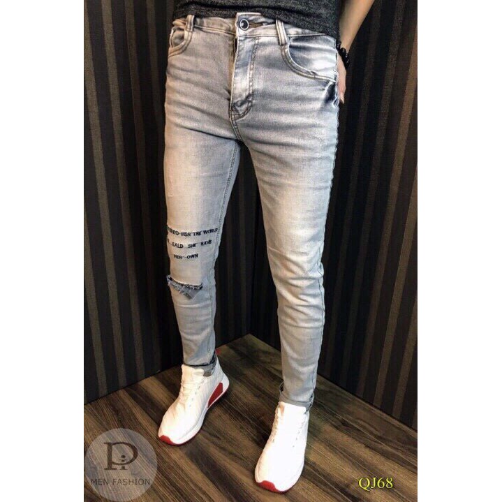 QUẦN JEANS NAM RÁCH GỐI IN CHỮ CÁ TÍNH J68