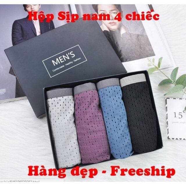 ️QUẦN SỊP ĐÚI NAM :gồm hộp 4 quần sip đùi nam thông hơi Quần đùi nam thông hơi chất liệu thông hơi 100% .Siêu mát siêu nhẹ.Dáng đùi lịch sự kín đáo.Cạp nhỏ mặc nhẹ ko gây khó chịu trên da Sịp đùi nam dáng dài đến đùi, ôm sát body trẻ trung, cuốn hút mà vẫn tạo cảm giác thoải mái. Thiết kế quần "thông hơi" với các lỗ nhỏ, cho bạn tự tin vận động, tạo vẻ quyễn rũ đầy nam tính. Cạp chun bản rộng co giãn, phù hợp với nhiều lứa tuổi, không gây hằn trên da. Chất liệu: cotton, ploy Màu sắc: 4 màu như hình Size L: 45-60kg Size Xl: 60-70kg Size XXL: 70-80kg SIze 3XL : 80kg trở lên Ngoài cân nặng, còn tùy thuộc rất nhiều vào chiều cao. Để chọn size chính xác nhất, bạn vui lòng tham khảo bảng hướng dẫn chọn size trên ảnh sản phẩm.