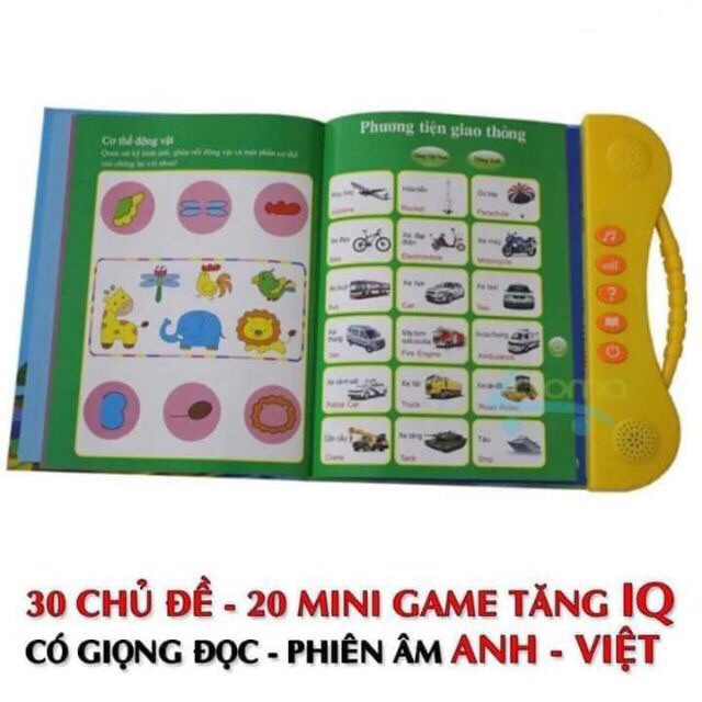 ️SÁCH ĐỌC SONG NGỮ VIỆT ANH PHÁT TRIỂN KĨ NĂNG CƠ BẢN CHO BÉ ☀Từ 2 tuổi, trí não trẻ bắt đầu phát triển mạnh, đây là thời điểm thích hợp để giúp con làm quen với các hình ảnh, âm thanh về các con vật, đồ đạc gia đình, con số và mặt chữ... ☀Bạn đang băn khoăn không biết lựa chọn phương pháp nào để giúp con nhận diện các sự vật, hiện tượng, con số, mặt chữ một cách tốt nhất. Chúng tôi xin giới thiệu tới bạn cuốn sách điện tử giúp bé có thể thích thú học cách nhận biết và phát âm các hình ảnh sự vật, hiện tượng, con số... bằng tiếng Việt và tiếng ➡➡➡THÔNG TIN CHI TIẾT VỀ SẢN PHẨM: ☀Cuốn sách điện tử thực sự ý nghĩa cho các bé từ 2-7 tuổi ☀Sách song ngữ Việt và Anh với nhiều hình minh họa sống động ☀Âm thanh giọng chuẩn, nhiều bài hát và câu chuyện cổ tích hay ☀Sách với nhiều chủ đề thú vị trong cuộc sống ☀Mỗi trang được trình bày bằng song ngữ ANH VIỆT, giúp bé học cách phát âm tiếng việt và tiếng anh. Bé chỉ cần chọn hệ ngôn ngữ và nhấn vào hình ảnh cần học là có thể nghe và phát âm theo sách ☀ Sách điện tử GGL được thiết kế với âm giọng chuẩn của tiếng Việt và Tiếng Anh. ☀ Sách GGL còn được tích hợp nhiều câu truyện cổ tích hay mà các bé rất thích được nghe kể. chỉ cần nhấn nút trên bảng điều khiển và chọc câu truyện cần nghe. ☀ Ngoài ra sách còn có chức năng nghe nhạc và kiểm tra bài đã học, giúp ba mẹ luôn kiểm tra được những gì bé đã học được.