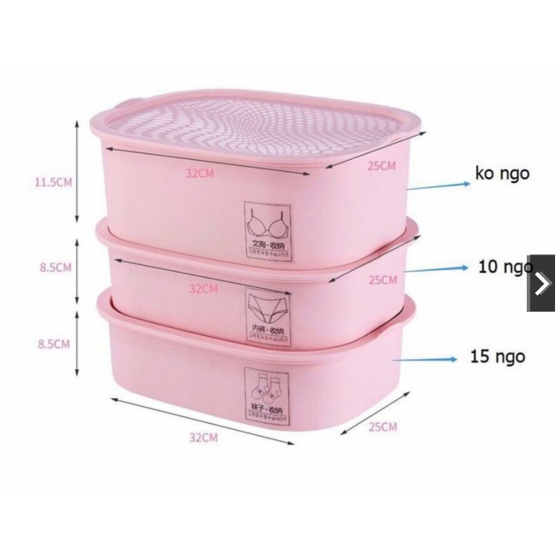 ️Thương hiệu: LifestyleChất liệu: Nhựa PP Set gồm 3 hộp cùng màu: 1 hộp không ngăn để đựng áo chip 1 hộp 10 ngăn để đựng quần chip 1 hộp 15 ngăn để đựng tất. Hộp có nắp đậy, siêu sạch sẽ. Kích thước: 29x22x8.5cm - giúp bạn sắp xếp đồ lót của mình một cách thật ngay ngắn, gọn gàng, tránh tình trạng áo lót bị móp hoặc để lẫn lộn khó tìm khi cần thiết. - Gồm 15 ngăn nhỏ đựng vớ và 8 ngăn lớn đựng đồ lót và khay to đựng áo con