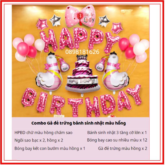 ️Tất cả các sản phẩm đều là hàng có sẵn đã đc chọn lọc quý khách hoàn toàn yên tâm về chất lương sản phẩm. Combo Gà đẻ trứng bánh sinh nhật màu hồng gồm có : HPBD chữ màu hồng chấm sao Bánh sinh nhật 3 tầng cỡ lớn x 1 Ngôi sao bạc x 2, hồng x 2 Gà đẻ trứng màu hồng x 2 Bóng bay kết con bướm màu hồng x 1 Bóng bay cao su nhiều màu x 12 Tặng kèm: 1 bơm hơi + 1 ruy băng + 1 keo dán Quý khách hoàn toàn được xem hàng trước khi thanh toán Đảm bao giao hàng cho bên vận chuyển trong 24h kể từ khi đặt hàng, đơn hàng sau 5h chiều ngày hôm sau phát hàng Hỗ trợ đổi trả trong 7 ngày nếu do lỗi của shop hoặc nhà sản xuất -------------------------------------------------------------- Cách sử dụng: Set bóng dùng van khóa 1 chiều. Quý khách chỉ cần bơm căng lên vừa phải rồi rút bơm ra. Hơi sẽ tự động khóa lại. Ko cần dùng dây buộc, có thể dùng nhiều lần, bóng bơm căng có thể để đc 2-3 tháng hoặc lâu hơn. Shop chuyên tư vấn theo tiêu đề hoặc lên ý tưởng các sự kiện Sản phẩm chất lượng như hình quý khách yên tâm khi đặt hàng Đội ngũ nhân viên làm việc chuyên nghiệp tư vấn nhiệt tình nên QUÝ KHÁCH có gì thắc mắc cứ liên lạc nhé Shop mặc định gửi Giao Hàng Nhanh đi các tỉnh trên TOÀN QUỐC ! #bóngbay #trangtrí #sinhnhật #giađình #bétrai #bégái #sựkiện #hônlễ #phòngngủ #ănuống #phòngkhách #settrangtriđẹp#phòngtânhôn#kỉniêmngàycưới#lãngmạn#cầuhôn Sau mỗi đơn hàng,nếu hài lòng về sản phẩm quý khách vui lòng đánh giá shop 5 sao kèm hình ảnh.shop sẽ có phần quà gửi tặng quý khách.Cảm ơn quý khách hàng đã tin tưởng và ủng hộ