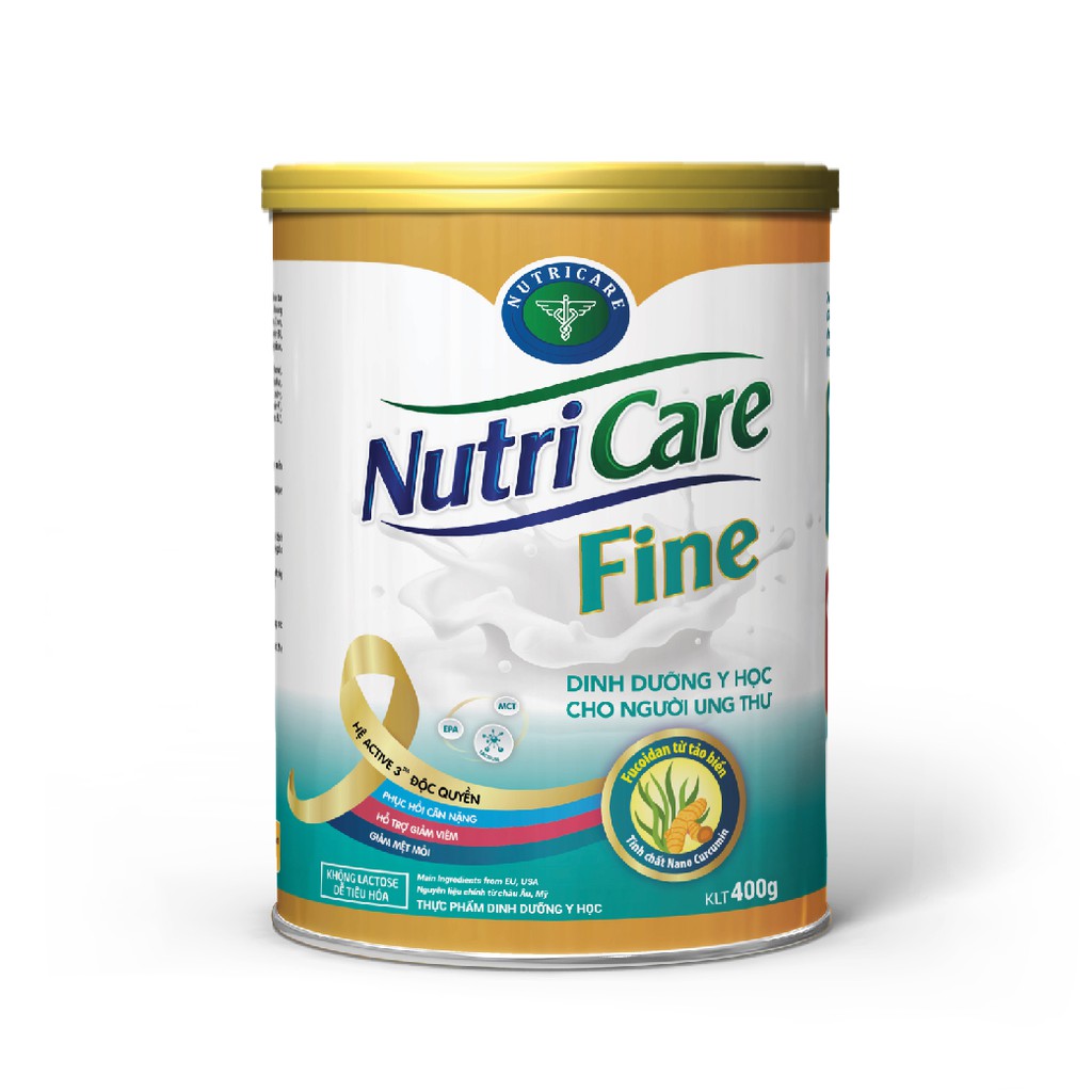 ️Tăng cường miễn dịch là ưu tiên số 1 trong diều trị bệnh ung thư – Giúp tăng hiệu quả điều trị – Giúp giảm tác dụng phụ các phương pháp điều trị – Giúp giảm thời gian điều trị Chăm sóc dinh dưỡng tốt đóng vai trò rất quan trọng trong việc tăng cường sức khỏe, hỗ trợ điều trị ung thư, giúp chống tình trạng sụt cân, suy mòn hay gặp ở bệnh nhân ung thư. Tình trạng sụt cân, suy kiệt nhanh do hóa trị và xạ trị ảnh hưởng rất lớn tới quá trình điều trị & hồi phục dinh dưỡng cho người bệnh. Nutricare Fine được nghiên cứu chuyên biệt cho bệnh nhân ung thư giúp phục hồi cân nặng, tăng cường miễn dịch và khả năng vận động, hỗ trợ quá trình điều trị hiệu quả. Nutricare Fine giải pháp y học tăng cường miễn dịch cho người bệnh ung thư. – Hệ ACTIVE 3 Độc quyền: Tăng cường miễn dịch đột phá với hệACTIVE 3 được nghiên cứu độc quyền giúp hỗ trợ giảm viêm tăng cường miễn dịch hiệu quả. – Tăng cân, chống suy mòn: Cao năng lượng, giàu protein, đặc biệt bổ sung đạm quý Argiline, BCAA và EPA – Giảm mệt mỏi, ngủ ngon: Độc đáo với đạm quý Lactium chiết xuất tự nhiên từ sữa kết hợp bộ đôi Magie – Vitamin B6. – Dễ tiêu hóa, ăn ngon miệng: 100% chất xơ hòa tan giúp ăn ngon miệng, giảm táo bón. Đặc biệt không chứa Lactose. – Tăng cường vận động: Đa dạng Canxi, Vitamin D3, Phospho, giàu Omega 3 chất béo tốt cho tim mạch. Hệ ACTIVE 3 độc quyền là sự kết hợp hoàn hảo giữa dưỡng chất Fucoidan từ tảo biển và tinh chất nghệ Nano Curcumin giúp tăng cường miễn dịch tự nhiên, giảm tác hại hóa xạ trị và hỗ trợ điều trị y học. – Fucoidan đã có nhiều chứng minh tác dụng trong việc hỗ trợ ức chế, ngăn chặn sự phát triển của tế bào ung thư thông qua việctăng cường hệ miễn dịch tự nhiên của cơ thể. Theo một nghiên cứu của Kim EJ và cộng sự năm 2010 cho thấy: Fucoidan làm giảm đáng kể số lượng tế bào ung thư trực tràng sau 3 ngày sử dụng so với nhóm chứng không dùng Fucoidan. [1] – Nano Curcumin với các nghiên cứu chỉ ra rằng đặc tính chống ung thư mạnh của Curcumin được thực hiện thông qua khả năng tăng cường kháng sinh chống oxi hóa và các cơ chế kháng viêm. [2,3] (1) Đối tượng sử dụng: Bệnh nhân ung thư, suy giảm hệ miễn dịch (2) Công dụng: TĂNG CƯỜNG MIỄN DỊCH TỰ NHIÊN CỦA CƠ THỂ,HỖ TRỢ ĐIỀU TRỊ UNG THƯ Hệ ACTIVE 3 độc quyền: kết hợp Fucoidan từ tảo biển cùng tinh chất nghệ Nano Curcumin giúp tăng cường miễn dịch tự nhiên của cơ thể, giảm viêm, ức chế sự phát triển của tế bào ung thư, giảm tác hại của hóa và xạ trị, hỗ trợ điểu trị y học. PHỤC HỒI SỨC KHỎE, CHỐNG SUY MÒN Cao năng lượng, giàu Protein đặc biệt bổ sung đạm quý Arginine, BCCA, kết hợp chất béo mạch trung bình (MCT) hấp thu nhanh giúp phục hồi cân nặng & tái tạo khối cơ, Omega 3 giàu EPA hỗ trợ cải thiện tình trạng suy kiệt, suy dinh dưỡng giúp tăng cường sức khỏe. GIẢM CĂNG THẲNG, MỆT MỎI; TĂNG CƯỜNG VẬN ĐỘNG Đột phá với Đạm quý Lactium chiết xuất tự nhiên từ sữa, kết hợp bộ đôi Magie – Vitamin B6 được chứng minh khoa học giúp giảm căng thẳng, mệt mỏi, giúp ngủ ngon. Bổ sung Canxi & Vitamin D3 cùng Magie, Phospho giúp giảm nguy cơ loãng xương, cải thiện chức năng xương khớp, đảm bảo duy trì và tăng cường vận động người ốm. HỖ TRỢ HỆ TIÊU HÓA, ĂN NGON MIỆNG Bổ sung 100% chất xơ hòa tan (FOS/Innulin) và Vitamin nhóm B giúp hỗ trợ hệ tiêu hóa, ăn ngon miệng, giảm táo bón. (3) Hướng dẫn sử dụng: + Rửa sạch tay và dụng cụ trước khi pha + Cho từ từ 47g Nutricare Fine (5 muỗng gạt) vào 180 ml nước đun sôi để ấm khoảng 45 -50 độ C, khuấy đều được 220ml dung dịch Nutricare Fine. + Hỗn hợp sau khi pha sử dụng hết trong vòng 3 giờ. + Dùng 2-3 ly/ngày hoặc theo hướng dẫn của bác sỹ/chuyên gia dinh dưỡng. (4) Bảo quản & hạn sử dụng: Bảo quản nơi khô ráo, sạch sẽ, thoáng mát, tránh ánh nắng trực tiếp. Lon khi đã mở phải được đậy kỹ và sử dụng hết trong vòng 3 tuần. Hạn sử dụng: 2 năm kể từ NSX, vui lòng xem cụ thể trên bao bì (5) Nhà sản xuất uy tín: Sản phẩm của công ty Nutricare là - THƯƠNG HIỆU QUỐC GIA 2018 - về thực phẩm dinh dưỡng Y Học. NUTRICARE được thành lập bởi các chuyên gia nghiên cứu hàng đầu về dinh dưỡng lâm sàng được đào tạo ở Hoa Kỳ, Châu Âu và Nhật Bản. Sản phẩm Nutricare được xây dựng để phù hợp với các đặc điểm sinh hoạt của người Việt Nam, dựa trên cơ sở ứng dụng khoa học thế giới, theo tiêu chuẩn mà Tổ Chức Y Tế Thế Giới (WHO) đặt ra. Toàn bộ sản phẩm của NUTRICARE được sản xuất trên dây chuyền áp dụng hệ thống quản lý chất lượng theo tiêu chuẩn quốc tế ISO 2000:2005 & GMP, HACCP có độ tin cậy và an toàn cao Sản phẩm được sản xuất hoàn toàn bằng nguyên liệu chính nhập khẩu từ Mỹ, Newzeland, EU Nutricare là công ty đã có gần 20 năm kinh nghiệm trong dinh dưỡng và sản xuất, là nhà cung cấ