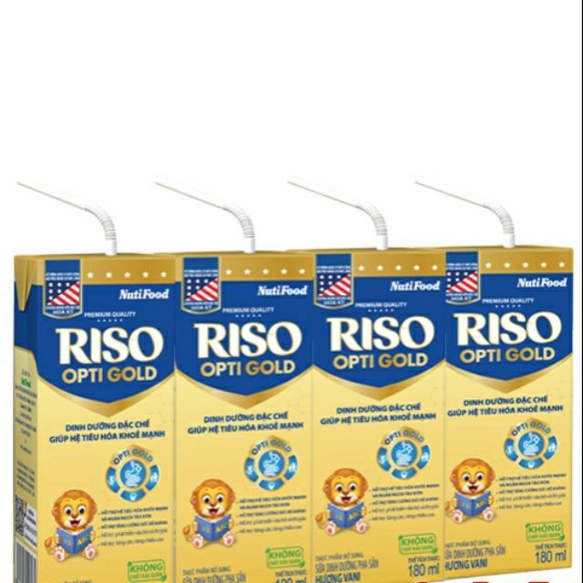 ️Thương hiệu Nutifood .Dinh dưỡng đặc chế giúp hệ tiêu hóa khỏe mạnh .Dành cho trẻ từ 1 tuổi trở lên .Công thức RISO OPTI GOLD trong sữa có công dụng: Hỗ trợ hệ tiêu hóa khỏe mạnh và ngăn ngừa táo bón Sản phẩm RISO bổ sung sữa non Colostrum, các loại đạm dễ hấp thu Lactoferrin, đạm Whey giàu Alpha Lactalbumin cung cấp các Axit amin thiết yếu, đặc biệt Tryptophan cùng hệ dưỡng chất Synbiotics là sự kết hợp giữa Prebiotics (FOS/Inulin) và Probiotics (Bifidobacterium lactis),… Hỗ trợ tăng cân tăng chiều cao Với công thức đặc chế OPTI GOLD, sản phẩm RISO có tỷ lệ Canxi : Phốt pho hợp lý, giàu Vitamin D3, cùng vitamin nhóm B và khoáng chất. .Hỗ trợ tăng cường sức đề kháng Công thức đặc chế OPTI GOLD của RISO bổ sung các Vitamin A, E, C, Selen là các chất chống oxy hóa, cùng với Kẽm và hỗn hợp Nucleotides. Sản phẩm RISO hỗ trợ bảo vệ trẻ khỏi các tác nhân gây hại từ môi trường bên ngoài. Hỗ trợ phát triển não bộ và thị giác Sản phẩm RISO có công thức đặc chế OPTI GOLD tạo sự hòa hợp độc đáo các dưỡng chất DHA, ARA, ALA, LA, Cholin, Taurin, Lutein và có mức hàm lượng DHA hợp lý mỗi ngày giúp đáp ứng theo khuyến nghị của các chuyên gia Y tế thế giới FAO/WHO (2010).