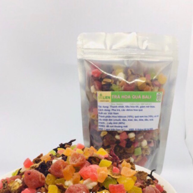 ️TRÀ HOA QUẢ BALI được gọi theo tên một loại thức uống phổ biến ở quần đảo Bali (Indonesia): cocktail trái cây. Món thức uống này được pha chế khá đơn giản bằng cách ngâm trái cây đã sấy khô và xắt hạt lựu trong nước sôi để ngậm nước, tạo ra một loại nước trái cây chua ngọt thơm nồng mùi hương dễ chịu từ các loại hoa trái. Trước đó, người ta ngâm một số loại trái cây trong nước đường rồi mới sấy, nên thành phẩm tạo ra còn có thể dùng như mứt sấy khô, khi dùng pha trà không cần thêm đường. QUI CÁCH 0,5Kg/1Kg bằng túi Zip NGUỒN GỐC: Việt Nam. HẠN SỬ DỤNG: 12 tháng CÔNG DỤNG: Pha trà, pha các nước detox hoa quả giải khát. ĐẶC ĐIỂM SẢN PHẨM: Trà gồm: Hoa hibicus khô (10%), quả sơn tra (10%), các trái cây nhiệt đới (chuối, đào, kiwi, táo, dứa, dâu, xoài, chanh…) sấy khô (80%). BẢO HÀNH: Đổi trả miễn phí với trường hợp bao bì hư hỏng, bong tróc và đổi trả khi sản phẩm không đúng như cam kết về sản phẩm và cam kết bán hàng của shop. CAM KẾT VỀ SẢN PHẨM: Trà sấy khô sạch, không chất bảo quản, không phụ gia, đảm bảo an toàn vệ sinh thực phẩm. CAM KẾT BÁN HÀNG: + Các bạn nhận được hàng chất lượng chính hãng lấy trực tiếp từ cơ sở sản xuất + Chúng tôi xin chịu đền bù 200% nếu như trà sấy khô bị ẩm mốc hư hỏng không đạt tiêu chuẩn. + Bán hàng bằng niềm tin đó là mục tiêu mà chúng tôi hướng đến. Vì thế chất lượng sản phẩm được chúng tôi đặt lên hàng đầu HƯỚNG DẪN SỬ DỤNG: Có nhiều cách pha trà, mình xin trình bày cách đơn giản nhất cho bạn: Bước 1: Cho ít Trà khoảng 10g đến 15g vào bình, tráng bình + trà trong 30s rồi bỏ nươc đầu đi. Bước 2: Rót nước sôi ở nhiệt độ 90 độ trở lên khoảng 200ml, ngâm trà trong khoảng thời gian từ 2-5 phút là có thể uống được nha bạn Muốn uống lạnh:lọc bỏ hoa trà, lắc đều, cất trong ngăn mát tủ lạnh hoặc bỏ thêm đá rồi uống. Chú ý là nếu thêm đá thì thay đổi tỉ lệ nước và hoa là 200ml nước tương ứng với 20-25gr trà ĐẶC BIỆT: Bạn có thể ăn cả xác trà trái cây. Trà có vị thơm tự nhiên của hoa quả,vị chua ngọt dịu thanh, bạn có thể pha ít mật ong, hoặc cỏ ngọt, hoặc đường phèn, hoặc cam thảo nếu thích muốn tăng hương vị TÁC DỤNG: Ngăn ngừa ung thư Giúp tiêu hóa tốt, có tác dụng tốt cho dạ dày, làm giảm chứng đầy hơi Tăng sức đề kháng Thanh nhiệt Giảm stress Điều hòa huyết áp, Ngăn ngừa hấp thụ chất béo, giảm mỡ thừa cho vóc dáng thon gọn và làn da mịn màng, tươi trẻ. Trà hoa quả Bali giúp cung cấp các loại vitamin A, B1, C, D,... và khoảng chất cho cơ thể, giúp trẻ lâu và giảm nguy cơ ung thư, tăng cường hệ miễn dịch và chức năng tiêu hóa. Trà này còn mang đến cho bạn một giấc ngủ ngon hơn chất lượng hơn, giảm stress BẢO QUẢN: để nơi khô ráo, thoáng mát, tránh ẩm thấp và ánh sáng trực tiếp.