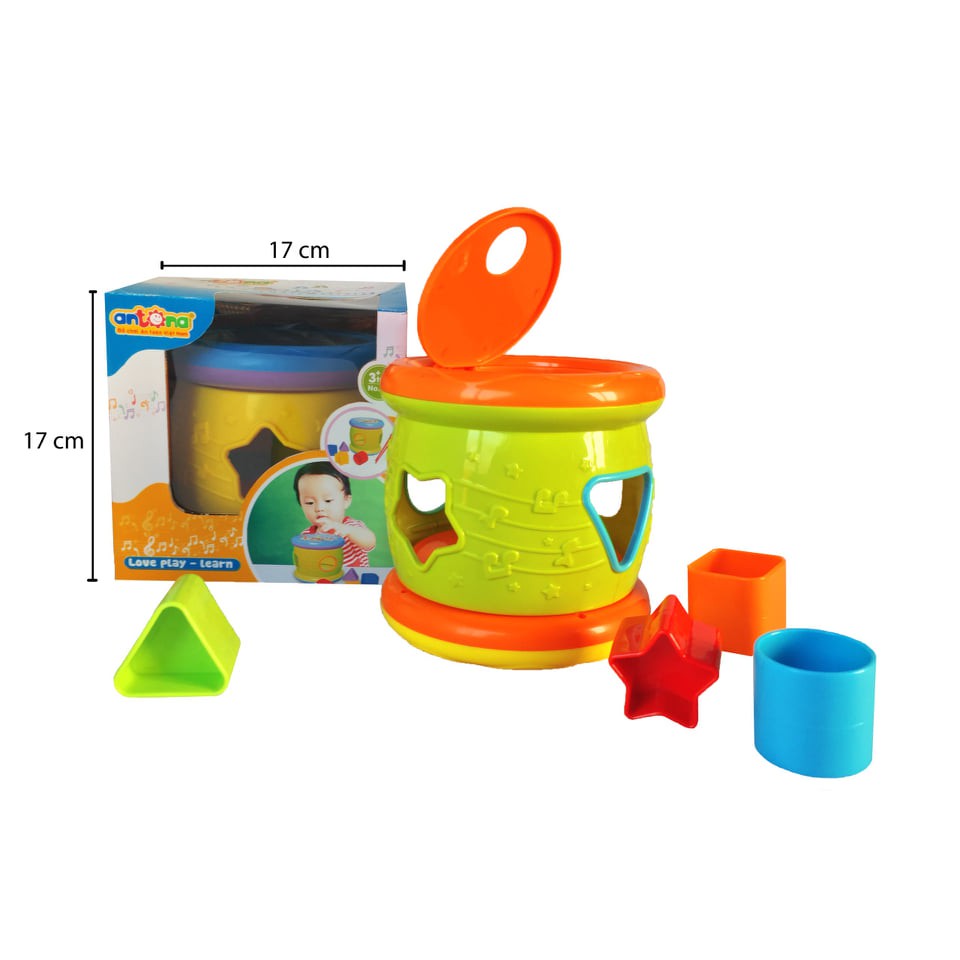 ️- Trống thả hình được làm từ 100% nhựa nguyên sinh, đảm bảo tuyệt đối an toàn cho bé khi vui chơi. - Sản phẩm có 5 cách chơi thú vị như: Bé chơi thả hình, Bé chơi đánh trống bằng tay, Bé chơi đánh trống bằng dùi, Bé chơi như một chiếc xúc xắc và Bé chơi trống lăn tròn - Mặt trống được làm từ nhựa trong, giúp các bé có thể nhìn rõ được những hạt nhựa đầy màu sắc bên trong - Khi đánh trống, bé có thể nhìn thấy những hạt nhựa đầy màu sắc cùng nhau nhảy múa. - Trên mặt trống có những họa tiết trang trí vô cùng đáng yêu và ngộ nghĩnh. Deco của sản phẩm là những bức tranh vô cùng dễ thương. - Mặt trống có thể xoay tròn, tạo ra thêm nhiều âm thanh vui nhộn cho các bé. - Bề mặt sản phẩm nhẵn mịn, không có các cạnh sắc nhọn - Các ô thả được bo tròn, giúp các bé dễ dàng hơn trong quá trình chơi. - Các khối thả hình to, đa dạng, sử dụng các màu sắc khác nhau - Bên trong khối thả hình cũng được sử dụng những họa tiết trang trí đáng yêu và ngộ nghĩnh. - Nắp mở thông minh được đặt ở mặt đáy trống, giúp các bé có thể dễ dàng lấy các hạt thả ra sau khi chơi xong. - Sản phẩm có nhiều màu sắc đa dạng - Dùi trống được thiết kế với những đường vân nổi, giúp các bé dễ dàng cầm nắm trong quá trình chơi. + Bé học màu sắc: Sản phẩm bao gồm nhiều màu sắc đa dạng và hấp dẫn, sẽ giúp các bé tập làm quen và nhận biết với các màu. + Bé học nhận biết hình khối: sản phẩm bao gồm các hình khối cơ bản, giúp các bé nhận biết và làm quen. Đây là bước đầu quan trọng cho bé dễ tiếp cận với môn toán học sau này. + Bé sẽ được phát triển tư duy logic và rèn luyện tính kiên trì: giúp phát triển tư duy nhận biết, suy luận hình ảnh cho bé qua việc bé phải tìm đúng hình mới có thể đút vừa lọt vào trong trống + Rèn luyện tinh: bé cần phải biết phối hợp giữa tay và mắt để tìm ra cho đúng hình khối và ô thả cần thiết bởi mỗi ô thả được thiết kế chỉ thả đúng một hình duy nhất, các hình không thể thả lẫn ô được với nhau. + Bé sẽ được rèn luyện tính gọn gàng, ngăn nắp: Sau khi chơi xong các hạt thả, bé có thể thả các hạt thả vào trong trống và cất đi một cách gọn gàng, ngăn nắp. Sản phẩm bao gồm: 1 trống thả hình 4 hình thả 2 dùi trống