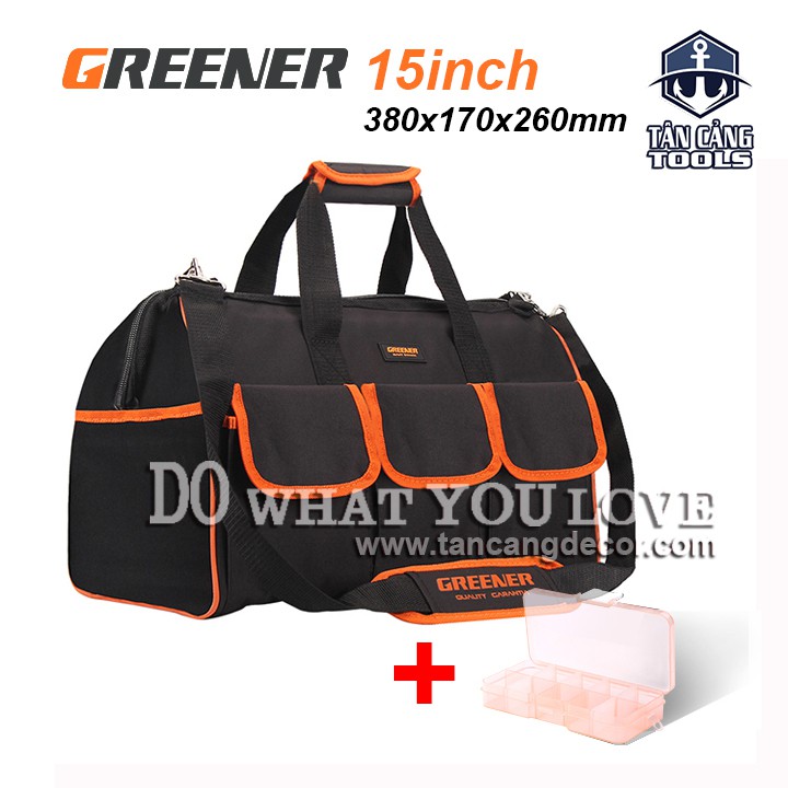 ️* Mô Tả Sản Phẩm : - Thương Hiệu : GREENER - Xuất Xứ : Trung Quốc. - Màu Sắc : Màu Cam - Đen - Chất Liệu : Vải Oxford chống nước 1680D - Nút Chân được làm từ nhựa cứng tổng hợp chống ăn mòn - Kích Thước Túi : Ngang 380 x Rộng 170 x Cao 260 mm. - Kích Thước dây đeo : Chiều dài dây 700 - 1200 mm - bản dây 38 mm - bản đeo vai 75 x 210 mm - Trọng Lượng : 250 Gram. - Bộ sản phẩm bao gồm : + Túi đừng đồ nghề. + Quai đeo. - Video tham khảo : https://www.youtube.com/watch?v=8mV-Jx5d86s * Tính Năng Sản Phẩm : - Sản phẩm với thiết kế 6 túi bên ngoài, bao gồm 3 túi trước dán kín, 3 túi mở phía sau.Ngoài ra, sản phẩm trang bị thêm 6 túi nhỏ bên trong túi xách tăng khả sắp xếp và phân khu để vật dụng. - Được cấu tạo từ Vải Oxford 1680D chuyên dụng có khả năng chống thấm nước cao.Đường may 2 lớp nhằm tăng độ bền so với các sản phẩm thông dụng. - Với 5 chân đế nhựa cứng bên dưới và phần đáy được cấu tạo từ vải PE chống thấm cao nhằm bảo quản sản phẩm cũng như chống ăn mòn khi di chuyển túi đựng đồ nghề khi đi công trình. - Đặc điểm nổi bật của sản phẩm là phần móc dây đeo.Sản phẩm ứng dụng móc treo dạng tam giác giúp túi đựng thẳng đứng khi đeo, cũng như chống bào mòn phần vải khi sử dụng hơn so với dạng móc nửa Elip. - Với thiết kế bắt mắt, tiện dụng, giá thành phù hợp, sản phẩm chính là vật dụng không thể thiếu cho anh em công trình trong việc chuẩn bị đồ nghề và bảo quản công cụ.
