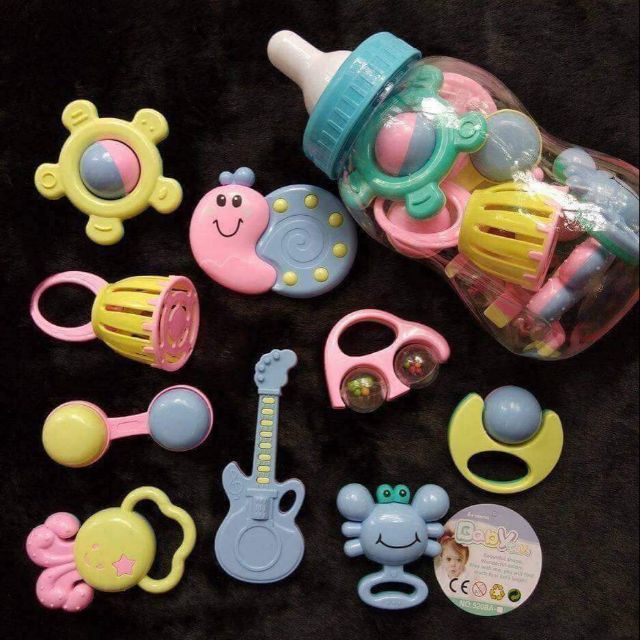 ️Xúc xắc bình ti Baby Toys 9 món cho bé Sản phẩm gồm nhiều xúc xắc lớn nhỏ,nhiều màu sắc giúp kích thích thính giác, thị giác của bé.Vừa đem lại cho bé cảm giác thích thú với nhiều món đồ chơi với hình thù khác nhau, vừa mang lại cho bé những giờ phút vui chơi ý nghĩa. Kiểm định rõ ràng, chất liệu an toàn Đồ chơi hộp xúc xắc bình sữa được làm từ nhựa cao cấp, không chứa các nhân tố độc hại gây ảnh hưởng tới sức khỏe của bé, bảo đảm vệ sinh và an toàn cho trẻ nhỏ.Những chiếc xúc xắc được đựng trong hộp nhựa đóng nắp an toàn, đảm bảo vệ sinh và thuận tiện bảo quản. Hình ảnh ngộ nghĩnh,thiết kế đa dạng mô phỏng các sự vật ngộ nghĩnh như: bạn hươu, bạn rùa, chú hề, bông hoa,… cho bé làm quen với hình ảnh mới lạ.Từ đó hỗ trợ kích thích tư duy để trẻ nhận biết và tập ghi nhớ sự vật một cách tự nhiên nhất. Giúp phát triển các giác quan của bé Túi đồ chơi bao gồm những chiếc xúc xắc có màu sắc rực rỡ, nổi bật, kích thích thị giác với nhiều gam màu tươi sáng. Từ đó, bé sẽ quan sát nhiều hơn và bước đầu làm quen với các màu sắc cơ bản. Xúc xắc phát âm thanh chuông hay tiếng động va đập của các hạt nhựa tròn bên trong vui tai khi bé tác động vào, không những thu hút sự chú ý của bé, giúp bé chơi ngoan mà còn cho bé lắng nghe và bước đầu tập cảm nhận âm thanh đa dạng. Xúc xắc được thiết kế vừa vặn với cỡ tay của bé, kết hợp cùng các vòng tròn tay cầm để bé dễ dàng luyện tập cầm, nắm và cảm nhận từ xúc giác. Các xúc xắc có thiết kế ngộ nghĩnh cùng âm thanh vui nhộn của xúc xắc kích thích bé vận động cơ tay nhiều hơn thông qua cử động lắc, xoay,…