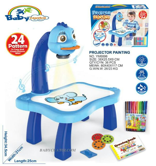 ️Chi tiết sản phẩm Bộ đèn bàn máy chiếu tập vẽ cho bé được làm hoàn toàn bằng loại nhựa ABS chuyên dùng sản xuất đồ chơi trẻ em, đặc biệt không chứa các chất độc hại ảnh hưởng đến sức khỏe của bé. Với chiếc đèn học máy chiếu mini, qua những lăng kính của máy chiếu, bé yêu dường như trở nên tự tin, năng động hơn, tăng cường khả năng diễn đạt và lối kể chuyện, luôn tìm tòi và khám phá thế giới xung quanh. Đặc biệt qua những hình ảnh được chiếu lên mặt bàn, bé sẽ học vẽ hình các con vật, tập tô màu, để nhận biết các màu sắc có thể phát triển tư duy sáng tạo, phẩm chất nghệ thuật cho trẻ ngay từ bé. Hướng Dẫn Sử Dụng: - Bộ sản phẩm chạy bằng 3 pin tiểu. Công tắc điều khiển được thiết kế thành hình chiếc chiếc sừng nhỏ xinh của chú khủng long ăn cỏ ngộ nghĩnh với 2 nấc, dịch chuyển 1 nấc đèn sẽ sáng, dịch chuyển nấc tiếp theo đèn sẽ phát ra tiếng nhạc du dương khiến bé yêu vô cùng thích thú. - Bộ đèn học vẽ gắn kèm 3 vòng tròn như những cuộn phim có những hình ảnh con vật đáng yêu hay hình ảnh những đồ vật thân thuộc. Khi chèn vào phần đầu, chiếc đèn học sẽ biến thành một chiếc máy chiếu thần kì chiếu ra các hình vẽ của hình mẫu giúp bé yêu tìm tòi khám phá thế giới và tô lại những hình ảnh được hiện ra trên mặt bàn trắng hoặc tự vẽ sang vở trắng với những sắc màu đa dạng của bút vẽ. - Phía dưới đèn có một chốt điều chỉnh độ nét của hình ảnh được chiếu ra giúp bảo vệ độ an toàn cho đôi mắt của bé. - Ngoài ra, ở mỗi hình mẫu còn in kèm cả từ vựng tiếng anh thông dụng giúp bé làm quen với tiếng Anh ngay từ nhỏ. - Mặt bàn được làm bằng chất liệu giống như bảng phooc khi vẽ trực tiếp lên bàn, bé có thể dễ dàng dùng khăn lau sạch. Thông tin kỹ thuật: - Sản phẩm: Bộ đèn bàn máy chiếu tập vẽ cho bé - Công dụng: Giúp bé tập vẽ, tăng cường tư duy, khả năng nhận biết màu sắc, con vật... - Bao gồm: 1 đèn bàn máy chiếu, 1 cuốn vở vẽ 10 trang, 24 hình mẫu đặt trong 3 màn chiếu hình tròn, 1 bộ bút nước vẽ và khăn lau - Đối tượng sử dụng: Dành cho bé trên 3 tuổi - Chất liệu: Nhựa - Màu sắc: Xanh Kích thước: 25cm x 21cm x 34.5cm