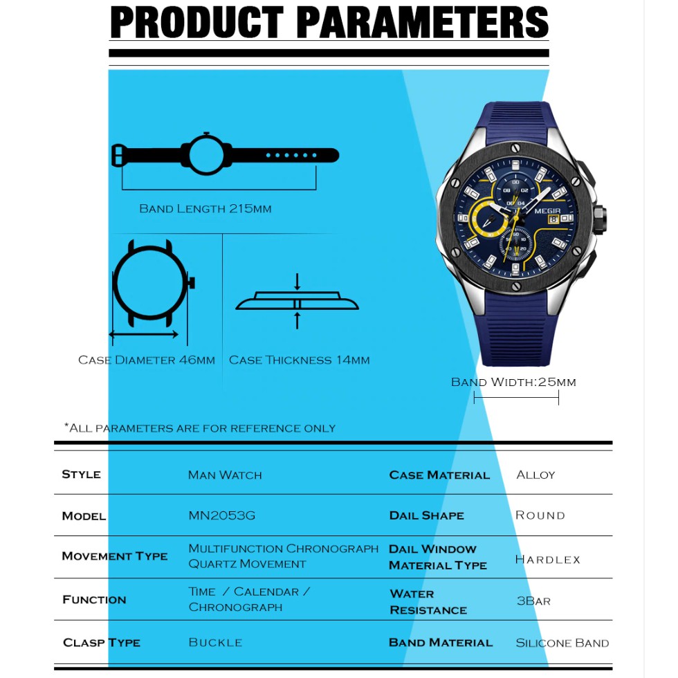 ️◈ THÔNG TIN NỔI BẬT: - Brand: Reward - Model: KT2053 - Xuất xứ: (Công nghệ Nhật Bản, Lắp ráp tại HongKong) - Kiểu máy: Quartz, máy Nhật - Chống nước: 3 ATM (Có khả năng chống nước sinh hoạt, đi mưa, không nên bơi, ngâm nước) - Chất liệu mặt trước: kính tráng sapphire MĐ1 , chống va đập, chống trầy - Chất liệu dây đeo: Silicone - Chất liệu: Vỏ hợp kim - Đường kính quay số: 40mm - Độ dày mặt: 14mm - Chiều dài dây đeo: 215mm - Chiều rộng dây đeo: 25mm - Trọng lượng: 108 gram - Kiểu khóa: Khóa kim - Loại hiển thị: Kim Đồng Hồ Lịch Dạ Quang QUY ĐỊNH BẢO HÀNH ✔ Đổi trả trong 7 ngày nếu hàng bị lỗi do nhà sản xuất như là hết pin, rớt kim, hư khóa, đồng hồ không chạy. ✔ Bảo hành pin và máy trong 12 tháng. Bị bất cứ vấn đề gì bạn cứ inbox shop sẽ luôn tư vấn và hỗ trợ bạn. ◈ BỘ SẢN PHẨM BAO GỒM ✔ Đồng hồ chính hãng 100% ✔ Hộp đồng hồ cực kì đẹp, sang trọng (rất thích hợp làm quà tặng) ✔ Thẻ bảo hành, hướng dẫn sử dụng, bảo quản sản phẩm ◈ NHỮNG CAM KẾT KHI MUA HÀNG CỦA SHOP Chào mừng bạn ghé thăm cửa hàng REWARD VIET NAM: ✔ Phân phối chính thức, cam kết 100% chính hãng Megir ✔ Cam kết về sản phẩm: Sản phẩm này 100% hàng chính hãng và giống y hệt ảnh, nếu nhận hàng khách không ưng ý hãy liên hệ với shop nhé, shop cam kết sẽ nhận lại hàng và hoàn tiền ngay. ✔ Hoàn 200% nếu phát hiện hàng giả. ✔ Bảo hành 12 tháng. (Bằng hóa đơn điện tử) ✔ Không nhập hàng loại 1 giá rẻ, loại khắc thương hiệu Megir. (loại này rất khó phân biệt, tỷ lệ lỗi máy, nóng máy hay hao pin sau một thời gian sử dụng rất cao) ✔ Uy tín bán hàng được đặt lên hàng đầu, không kinh doanh chộp giật. ✔ Chúng tôi nói không với hàng giá rẻ kém chất lượng, shop chỉ nhập duy nhập hàng cao cấp, sản phẩm của shop có chất lượng cao. ✔ Tất cả sản phẩm đều được kỹ thuật kiểm tra đạt chuẩn trước khi giao cho khách, bạn hoàn toàn có thể yên tâm sử dụng hay làm quà tặng. Hãy mua thử sản phẩm của chúng tôi, hài lòng hãy mua tặng người thân bạn bè. Nó thật sự là một món quà đặc biệt và quý giá. THÔNG TIN THƯƠNG HIỆU Founded in 2006, the brand, REWARD, has its own extended meaning as feedback and reciprocation, with its founder Mr. Li’s years of dedication into the watch industry and unique understanding and comprehension of the watch. Since its establishment, the REWARD brand has been adhering to the design style of elegance, simplicity and decency. Megir watches have stood out in the forefront of fashion, for the spirit of persistent pursuing of perfection and advanced insights into vogue. The almost demanding perseverance in quality and the almost obsessive desire for individuality and freedom make the REWARD wristwatch always have a unique love for innovation, thus making the REWARD wristwatch unique and well-known in the industry.