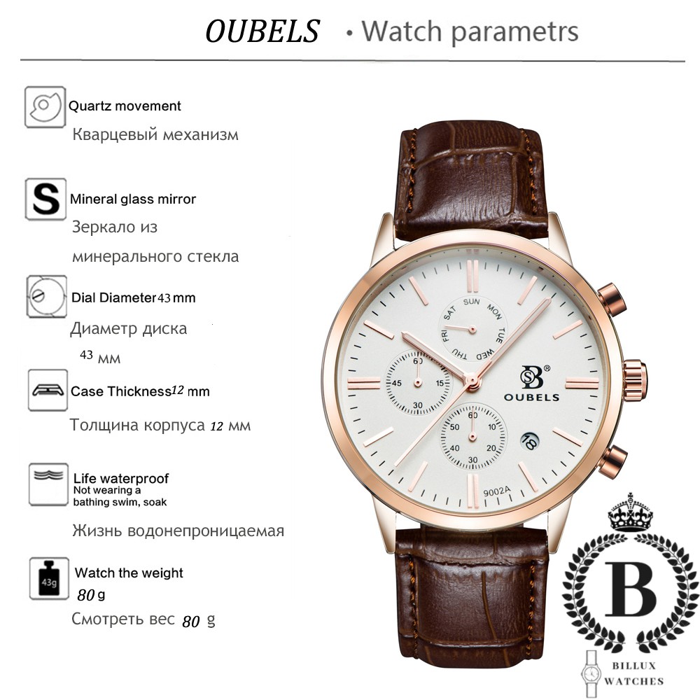 ️Thông tin sản phẩm • Chất liệu vỏ: Kim loại (Thép không gỉ) • Chất liệu dây: Da tổng hợp PU • Chất liệu mặt trước: Kính cứng • Kích thước mặt: 43mm x 7.8mm (Rộng x dày) • Kích thước dây: 20mm x 230mm (Rộng x dài) • Độ chịu nước: 3ATM – Rửa tay, đi mưa nhẹ, rửa xe • Phù hợp đeo đi làm, đi học, dạo phố, xem phim, dự tiệc • Sản phẩm giống hình 100% Là món phụ kiện không thể thiếu dành cho phái mạnh, đồng hồ không chỉ giúp bạn quản lý chặt chẽ quỹ thời gian mà còn góp phần khẳng định gu thẩm mỹ tinh tế của chính mình. Với gam màu thu hút, đồng hồ có thể phối với bất cứ trang phục nào, từ những bộ công sở đến áo phông quần jeans, .... Chỉ cần khéo léo mix thêm vào “item” thích hợp, bạn hẳn sẽ trở nên thật phong cách trong mắt mọi người. Đồng hồ Billux là nhà phân phối sản phẩm đồng hồ Oubels ngay tại xưởng sản xuất. Điểm nhấn ở đây là đồng hồ máy Digital với giá tốt nhất thị trường hiện nay, nếu như bạn đang muốn có mẫu đồng hồ sang trọng và dễ dàng sở hữu với giá cả hợp túi tiền thì không nên bỏ qua dòng Oubels không thua gì những đồng hồ tiền triệu.