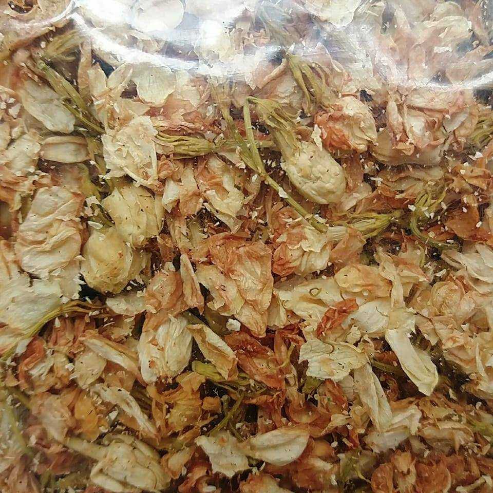 ️#hoanhai100g, #hoahong100, #bongcuctrang100, #bongcucvang100, #hoabachhop100 Công dụng của Trà Hoa Nhài Trà Hoa Nhài giúp ăn ngon hơn, tiêu hóa tốt hơn, hấp thu nhiều chất dinh dưỡng hơn. Người dùng vừa có thể thưởng thức trà như một thú vui tao nhã vừa có thể mang lại một cơ thể săn chắc, nhẹ nhàng như mong muốn. Không chỉ vậy, một tách trà mỗi ngày còn giúp bạn có được một giấc ngủ chất lượng, hạn chế tình trạng mất ngủ, ngủ không sâu giấc. Hoa Nhài cũng được kết hợp hoàn hảo với Chè Xanh tạo nên thức uống tao nhã của người dân Đồng bằng Bắc Bộ. Cách pha Trà Hoa Nhài Nguyên Bông Đúng Vị – Chọn lựa những bông hoa nhài được sấy khô, thơm ngát và không bị nấm mốc, mối mọt. Chuẩn bị: + Dụng cụ pha trà: ấm trà, chén tống/chuyên trà, chén quân (chén uống trà), xúc trà + Nguyên liệu pha trà: Trà Hoa Nhài Khô Nguyên Bông thượng hạng, nước (nên dùng nước lọc tinh khiết hoặc nước mưa, đã được đun nóng >90 oC để giữ nguyên hương vị trà). Cách pha: + Cho từ 10-12 bông trà hoa nhài nguyên bông sấy khô vào trong ấm trà 500ml + Đánh thức trà: Rót một chút nước sôi ra chén tống nhằm giảm nhiệt độ của nước xuống 85 độ C. Lưu ý: Không tráng trà khi uống trà nhài, vì khi tráng trà sẽ làm mất hương vị của hương nhài ban đầu + Ủ trà thêm nước nhiệt độ 90 độ C vào ấm cho đủ vừa lượng uống trong 3 tới 5 phút. + Rót nước từ ấm trà ra chén tống và sau đó rót để thưởng thức. Lưu ý: Hãy nhớ rằng bạn hãy pha trà với nước sao cho đủ với số lượng người uống. Làm như vậy để trà khỏi chín nhừ không mất đi hương vị, lại tránh bị nồng. Quý khách có thể pha và thưởng thức nhiều lần mà trà vẫn giữ được hương vị và màu nước. Sản phẩm của Như Ý Shop. HSD: 05/2020
