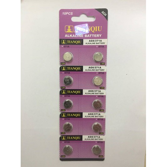 ️Mã tương đương: AG6 – LR920H – 371A Sử dụng cho: đồng hồ điện tử, các thiết bị điện, điện tử, đồ chơi v,v… Hãng sản xuất: TE/TIANQIU Kích thước: 9.5 × 2.1 mm Điện áp: 1.5V Loại pin: Alkaline Xuất xứ: China