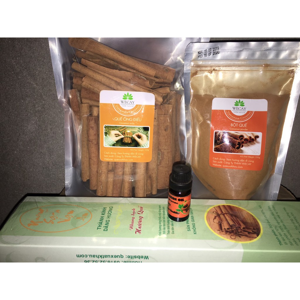 ️COMBO 1 TÚI BỘT QUẾ 250GRAM, 1 TÚI QUẾ ĐIẾU 500 GRAM, 1 LỌ TINH DẦU QUẾ 10ML VÀ 1 HỘP NHANG QUẾ CAO CẤP 160 CÂY Bộ 4 sản phẩm phù hợp sử dụng trong trong nhà của bạn với Quế CÔNG DỤNG CỦA QUẾ VÀ TINH DẦU QUẾ - Bột quế dùng Nấu ăn: Các món ăn như kho thịt, kho cá - Quế điếu dùng để Pha chế: Làm que khuất cà phê, sinh tố - và Trang trí decor: Trang trí mô hình, trang trí cây thông noel... - Tinh dầu quế dùng để thơm phòng, tủ đồ NHANG QUẾ CAO CẤP : - Hộp 160 cây 38cm, thời gian cháy 60-70 phút. - Được làm từ VỎ QUẾ và VỎ CÂY BỜI LỜI tạo kết dính tự nhiên. - Nhang quế cao cấp sạch 100% thiên nhiên dùng để thờ cúng, trừ tà, thanh lọc không khí HẠN SỬ DỤNG: trước ngày 15/07/2020 Về Shop :là nhà cung cấp sỉ vỏ quế tiêu chuẩn xuất khẩu tại vùng núi Trà Bồng, Quảng Ngãi, vì ở ngay vùng nguyên liệu nên vỏ quế luôn được lựa chọn tốt nhất và chi phí phải chăng từ khâu bóc vỏ đến đóng gói cho người sử dụng. Shop nhận gia công nhang Quế, Khuynh diệp, Trầm theo yêu cầu. Shop nhận sản xuất hàng thủ công mỹ nghệ quế và đóng gói bột quế theo yêu cầu. CƠ SỞ SẢN XUẤT: VẠN ÂN Đội 8,Thôn Bình Trung, xã Trà Bình, huyện Trà Bồng, tỉnh Quảng Ngãi Cần thông tin gì thêm kết bạn zalo mình giải đáp nhé: 0356.177.178 Thân mến