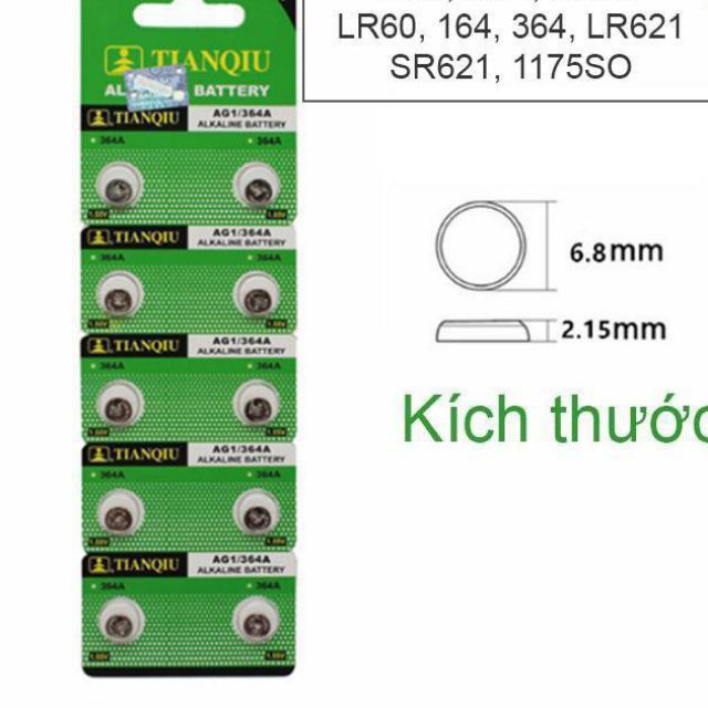 ️- Hãng sản xuất: TIANQIU - Model: Dòng AG3 - Xuất xứ: China - Màu sắc tổng thể: Màu xanh vỉ (Pin bạc) - Ứng dụng: AG1, LR621H, 364AAG1, SG1, SR60, LR60, 164, 364, LR621, SR621, 1175SO (cho hệ Đồng hồ, Máy tính, máy ảnh Mini.v.v.) - Kích thước: 6.8mm*2.1mm - Dung lượng: 1.5V-15mAh - Tiêu chuẩn chất lượng: IEC 60086-2 - Chỉ tiêu chất lượng: Không Thủy Ngân (Hg-0%) - Số lượng bán ra: 1 viên (1 vỉ) - Tình trạng sản phẩm: Mới, nguyên vỉ - Đóng gói: Pin 1.5V nhỏ đầu đũa AG1, vỉ nhựa đựng sản phẩm - Lưu ý: Khách hàng cần đảm bảo rằng pin trên thiết bị của bạn thực sự là hết điện, trước khi mua sản phẩm, ngài ra khi năng lượng trong pin đã dùng hết, vui lòng bỏ chúng vào thùng rác phân định, không vứt rác bừa bãi ảnh hưởng tới môi trường xung quanh. Nên tránh xa tầm tay của trẻ nhỏ và không bỏ chúng vào nơi nhiệt độ cao, hoặc ẩm thấp. - Bảo hành: Không bảo hành (Không có lỗi phát sinh) Tag: #ag1 #lr621 #g1 #364 #sr60 #lr60 #164 #364 #sr621 #1175so
