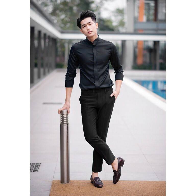 Áo sơ mi nam ngắn tay sọc caro - Cổ tàu
