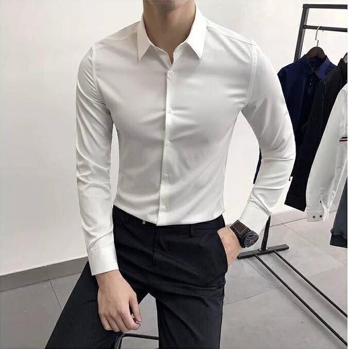 Áo sơ mi nam trắng cổ bẻ, dáng body tay dài - Dài tay