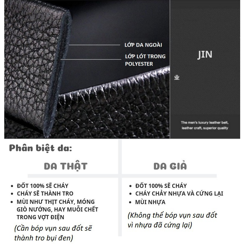 ️THÔNG SỐ CHI TIẾT SẢN PHẨM: • Chất liệu: Da • Tính năng Cortical: Da Bò lớp đầu tiên • Chất liệu khóa thắt lưng: Hợp kim • Phương pháp buộc: Khóa tự động • Giới tính áp dụng: Nam • Tuổi áp dụng: Tuổi trưởng thành • Thiết kế: Phong cách châu Âu và Mỹ • Hàng nhập khẩu, chính hãng JINFENCLUOTUO • Thích hợp cho những dịp quà tặng: Ngày của Cha, Lễ Tạ ơn, lợi ích của nhân viên, lễ kỷ niệm, kỷ niệm du lịch, quà tặng kinh doanh... ⭐LƯU Ý: Sản phẩm là móc khóa tự động (Không phải dạng bấm lỗ kiểu cũ). Mua sản phẩm về, quý khách ướm vừa với bụng và "cắt phần dây dư ở mặt thắt lưng" ==> Sau đó nắp lại mặt. CHÚ Ý: NÊN CẮT ÍT MỘT RỒI THỬ ĐỂ HIỆU QUẢ. - Chiều dài thắt lưng: 120cm ⭐CHÚ Ý PHÂN BIỆT DA GIẢ VÀ THẬT: Chào các bạn, tôi là chủ cửa hàng đồ da, tôi có cửa hàng tại Thượng Hải đã kinh doanh được gần 12 năm. Gần đây chúng tôi mới mở cửa hàng tại Việt Nam, chúng tôi rất bất ngờ về những hướng dẫn phân biệt đồ da trên mạng Việt Nam,99% nó không đúng sự thật. "Thông tin các cửa hàng da Việt Nam: Da thật đốt không cháy, hơ lửa không nhăn" ==>Các bạn hãy tưởng tượng da thật chính trên cơ thể mình có phải vậy không. Lửa đốt cái gì chả cháy, kim loại còn nóng chảy. (Hỏa duy nhất sợ Thủy) Ở đất nước chúng tôi, mọi người phân biệt đơn giản như sau: DA THẬT: - Đốt 100% sẽ cháy, cháy sẽ thành một khối đen, bóp nát sẽ thành tro. Tương tự như đốt gỗ củi, lúc đập ra sẽ có tro vì là "Hữu Cơ". Đặc điểm có mùi như móng giò thui hay gần nhất như mùi con muỗi bị vợt điện đốt vậy. DA GIẢ: - Đốt 100% sẽ cháy, cháy sẽ thành cục nhựa chảy xuống đất và cứng lại. Không thể bóp nát thành tro vì nhựa đã cứng lại. Và có mùi nhựa. Rất mong quý khách tìm hiểu kỹ trước khi đánh giá sản phẩm. CAM KẾT TỪ SHOP 1) Chất liệu da thật bọc 2 lớp ngoài, vật liệu lót trong Polyester. 2) Cam kết chất lượng và mẫu mã sản phẩm giống với hình ảnh. 3) Hàng được shop tuyển chọn kỹ càng trước khi giao đến tay khách. 4) Hoàn tiền nếu sản phẩm không giống với mô tả. 5) Được kiểm tra hàng trước khi thanh toán. (Vui lòng liên hệ nếu gặp khó khăn) -BẢO HÀNH QUÝ KHÁCH VUI LÒNG CUNG CẤP SỐ ĐIỆN THOẠI ĐẶT HÀNG. -Cửa Hàng chỉ bảo hành các lỗi kỹ thuật (như bung chỉ, da bị bong tróc). -Không bảo hành phụ kiện : Móc khóa, dây sản phẩm và mặt thắt lưng,…(Lỗi trong thời gian sử dụng) -Những thiệt hại trong quá trình sử dụng: sản phẩm bị rách, trầy xước do người sử dụng (va quệt, rạch, co kéo, đựng quá nặng…), phụ kiện bị hỏng va đập hoặc làm mất, bị hao mòn hoặc cháy trong quá trình sử dụng, hoặc do môi trường gây ra… ================================================= Quý khách hãy mua thử sản phẩm từ hãng JINFENCLUOTUO sẽ thấy chất lượng da, thiết kế sang trọng tính tế như nào so với các xưởng nhỏ lẻ trên thị trường. Nếu sản phẩm tốt hãy mua tặng người thân làm quà, giới thiệu bạn bè đến với chúng tôi nhé!